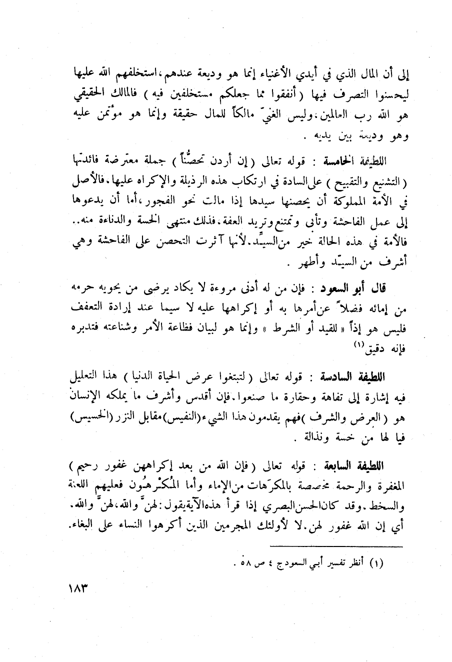قال أبو السعود: فإن من له أدنى مرؤءة لا يكاد يرضى من يحويه حرمه من إمائه فضلاً عن أمرها به أو إكراهها عليه لا سيما عند إرادة التعفف فليس هو إذاً «للقيد أو الشرط» وإنما هو لبيان فظاعة الأمر وشناعته فتدبره فإنه دقيق.