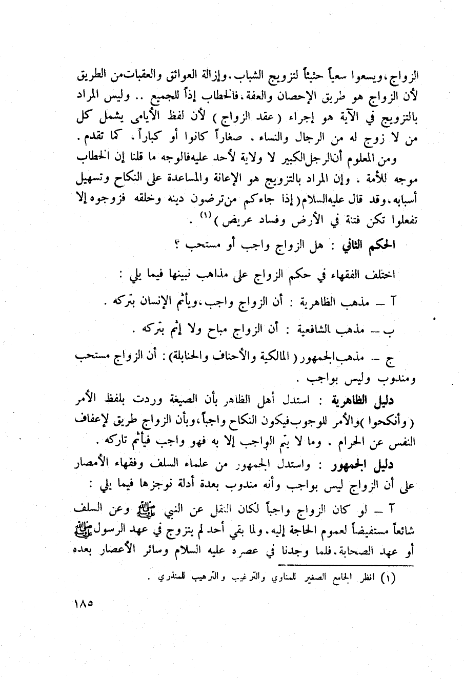 دليل الظاهرية: استدل أهل الظاهر بأن الصيغة وردت بلفظ الأمر (وانكحوا) والأمر للوجوب فيكون النكاح واجباً، وبأن الزواج طريق لإعفاف النفس عن الحرام، وما لا يتم الواجب إلا به فهو واجب فيأثم تاركه.
