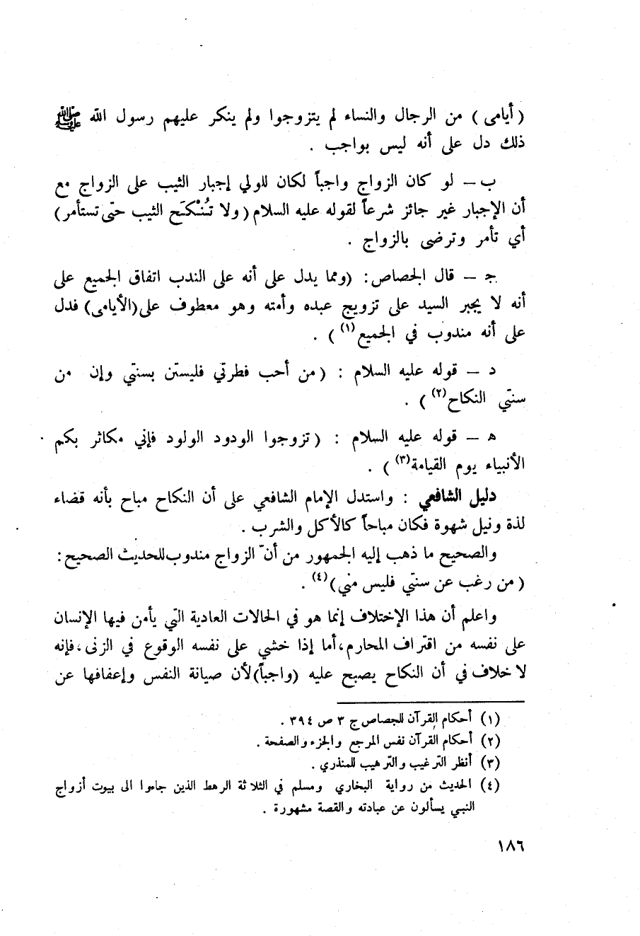 ب - لو كان الزواج واجباً لكان للولي إجبار الثيب على الزواج مع أن الإخبار غير جائز شرعاً لقوله عليه السلام: «ولا تُنْكَح الثيب حتى تستأمر» أي تأمر وترضى بالزواج.