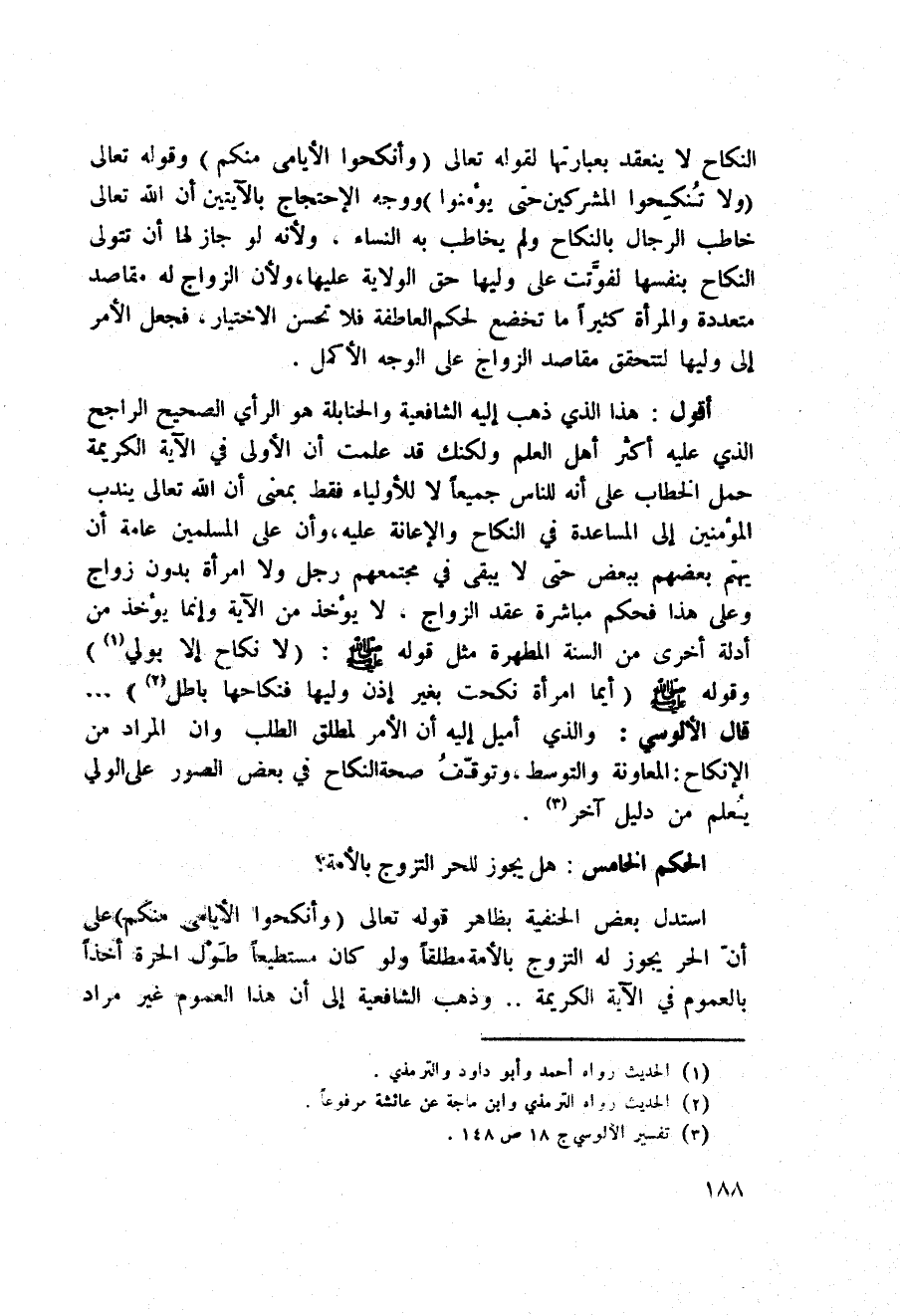 أقول: هذا الذي ذهب إليه الشافعية والحنابلة هو الرأي الصحيح الراجح الذي عليه أكثر أهل العلم، ولكنك قد علمت أن الأولى في الآية الكريمة حمل الخطاب على أنه للناس جميعاً لا للأولياء فقط، بمعنى أن الله تعالى يندب المؤمنين إلى المساعدة في النكاح والإعانة عليه، وأن على المسلمين عامة أن يهتم بعضهم ببعض حتى لا يبقى في مجتمعهم رجل ولا امرأة بدون زواج وعلى هذا فحكم مباشرة عقد الزواج، لا يؤخذ من الآية وإنما يؤخذ من أدلة أخرى من السنة المطهرة مثل قوله صَلَّى اللَّهُ عَلَيْهِ وَسَلَّم َ: «لا نكاح إلا بولي» وقوله صَلَّى اللَّهُ عَلَيْهِ وَسَلَّم َ: «أيما امرأة نكحت بغير إذن وليها فنكاحها باطل» . قال الألوسي: والذي أميل إليه أن الأمر لمطلق الطلب وإن المراد من الإنكاح: المعاونة والتوسط، وتوقّفُ صحة النكاح في بعض الصور على الولي يُعلم من دليل آخر.
