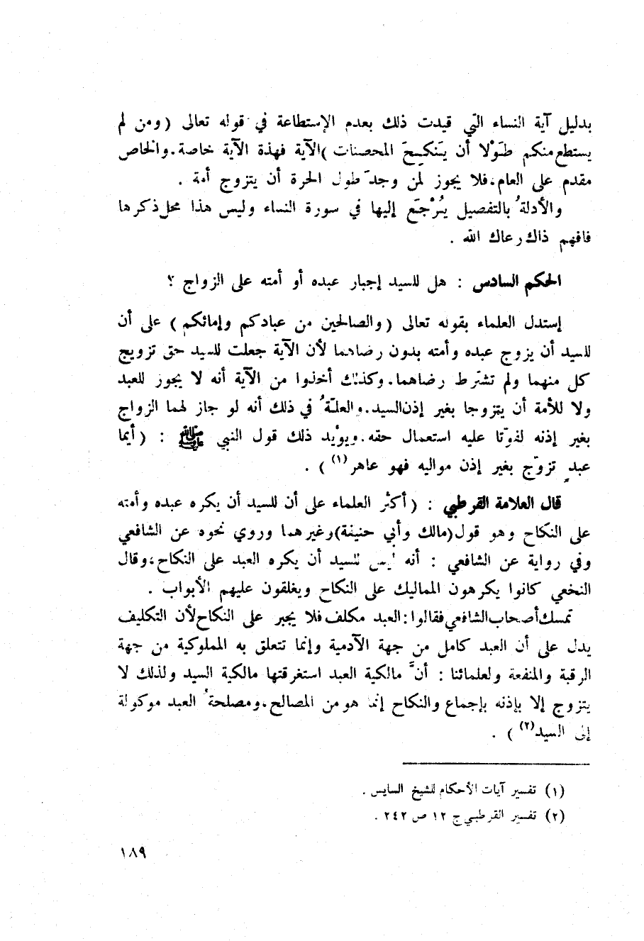 قال العلامة القرطبي: (أكثر العلماء على أن للسيد أن يكره عبده وأمته على النكاح وهو قول (مالك وأبي حنيفة) وغيرهما وروي نحوه عن الشافعي: أنه ليس للسيد أن يكره العبد على النكاح، وقال النخعي كانوا يكرهون المماليك على النكاح ويغلقون عليهم الأبواب.