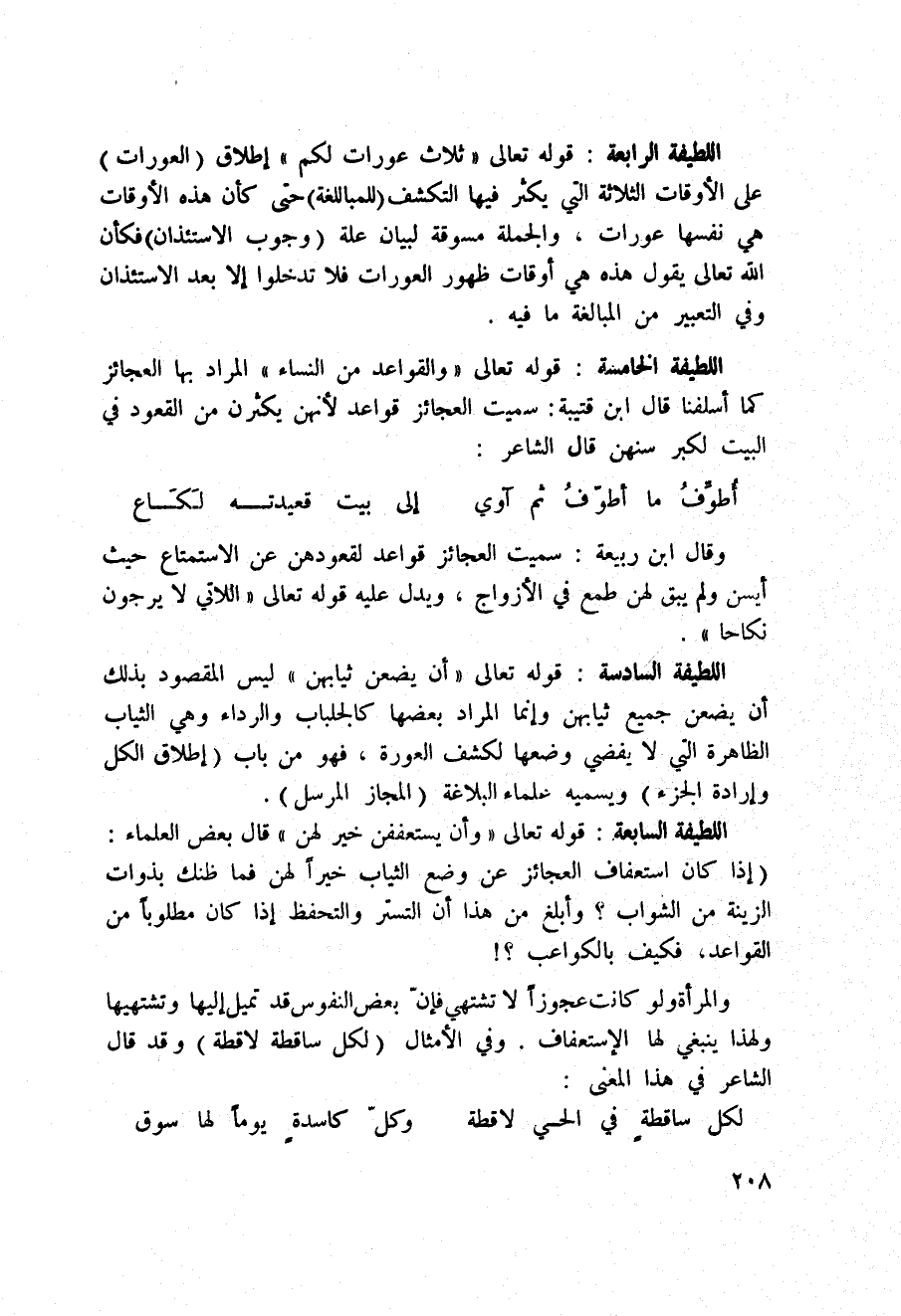 اللطيفة الخامسة: قوله تعالى: {والقواعد مِنَ النسآء} المراد بها العجائز كما أسلفنا قال ابن قتيبة: سميت العجائز قواعد لأنهن يكثرن من القعود في البيت لكبر سنهن قال الشاعر: