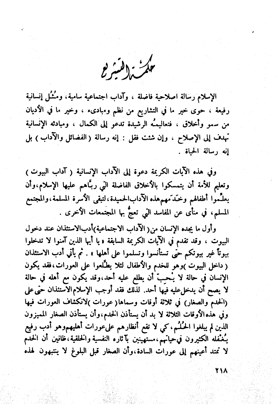 {ياأيها الذين آمَنُواْ لاَ تَدْخُلُواْ بُيُوتاً غَيْرَ بُيُوتِكُمْ حتى تَسْتَأْنِسُواْ وَتُسَلِّمُواْ على أَهْلِهَا} [النور: 27] . ثم يأتي أدب الاستئذان (داخل البيوت) وهو للخدم والأطفال لئلا يطَّلعوا على العورات، فقد يكون الإنسان في حالة لا يحِبّ أن يطلع عليه أحد، وقد يكون مع أهله في حالة لا يصح أن يدخل عليه فيها أحد. لذلك فقد أوجب الإسلام الاستئذان حتى على (الخدم والصغار) في ثلاثة أوقات وسماها (عورات) لانكشاف العورات فيها وفي هذه الأوقات الثلاثة لا بد أن يستأذن الخدم، وأن يستأذن الخدم، وأن يستأذن الصغار المميزون الذين لم يبلغوا الحُلُم، كي لا تقع أنظارهم على عورات أهليهم وهو أدب رفيع يُغْفله الكثيرون في حياتهم، مستهينين بآثاره النفسية والخلقية، ظانين أن الخدم لا تمتد أعينهم إلى عورات السادة، وأن الصغار قبل البلوغ لا ينتبهون لهذه
