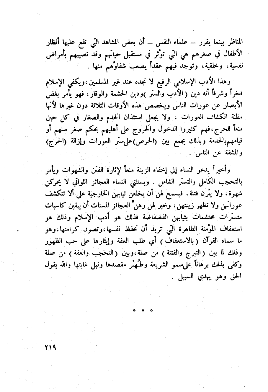 وأخيراً يدعو النساء إلى إخفاء الزينة منعاً لإثارة الفتن والشهوات ويأمر بالتحجب الكامل والتستر الشامل. ويستثني النساء العجائز اللواتي لا يحركن شهوة، ولا يثرن فتنة، فيسمح لهن أن يخلعن ثيابهن الخارجية على ألا تنكشف عوراتهن ولا تظهر زينتهن، وخير لهن وهنَّ العجائز المسنات أن يبقين كاسيات متسترات محتشمات بثيابهن الفضفاضة فذلك هو أدب الإسلام وذلك هو استعفاف المؤمنة الطاهرة التي تريد أن تحفظ نفسها، وتصون كرامتها، وهو ما سماه القرآن (بالاستعفاف) أي طلب العفة وإيثارها على حب الظهور وذلك لما بين (التبرج والفتنة) من صلة، وبين (التحجب والعفة) من صلة وكفى بذلك برهاناً على سمو الشريعة وطُهْر مقصدها ونيل غايتها والله يقول الحق وهو يهدي السبيل.