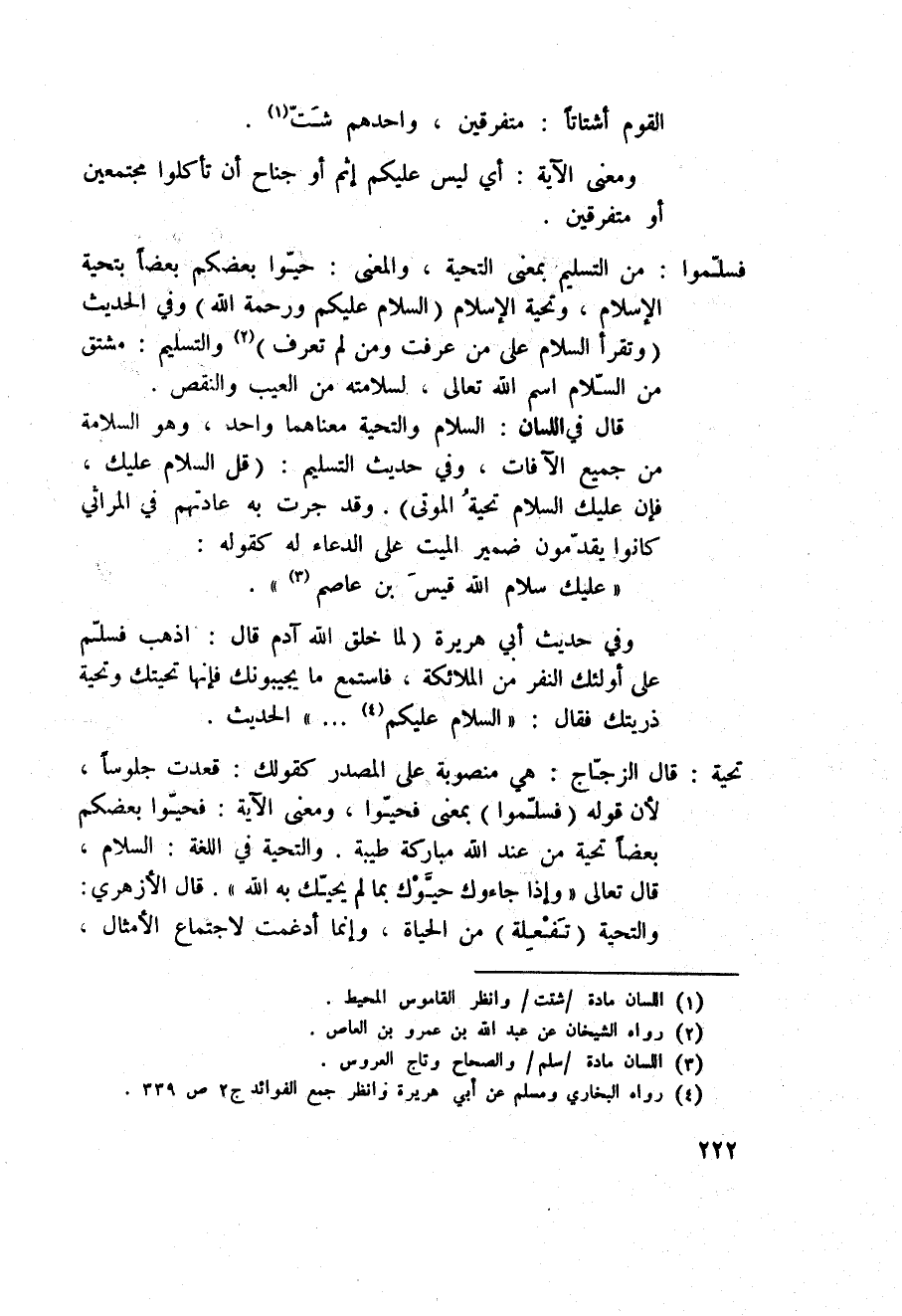 {تَحِيَّةً} : قال الزجّاج: هي منصوبة على المصدر كقولك: قعدت جلوساً، لأن قوله: (فسلّموا) بمعنى فحيّوا، ومعنى الآية: فحيّوا بعضكم بعضاً تحية من عند الله مباركة طيبة. والتحية في اللغة: السلام، قال تعالى: