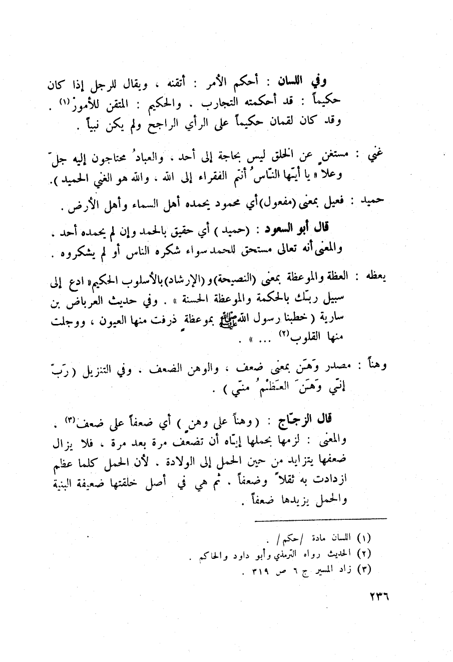 وفي «اللسان» : أحكم الأمر: أتقنه، ويقال للرجل إذا كان حكيماً: قد أحكمته التجارب، والحكيم: المتقن للأمور. وقد كان لقمان حكيماً على الرأي الراجح ولم يكن نبياً.