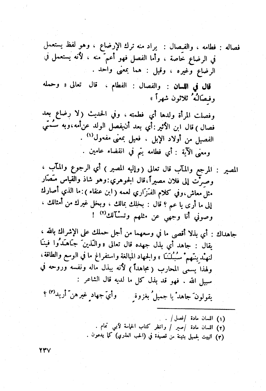 قال في «اللسان» : والفصال: الفطام، قال تعالى: {وَحَمْلُهُ وفصاله ثلاثون شَهْراً} [الأحقاف: 15] .