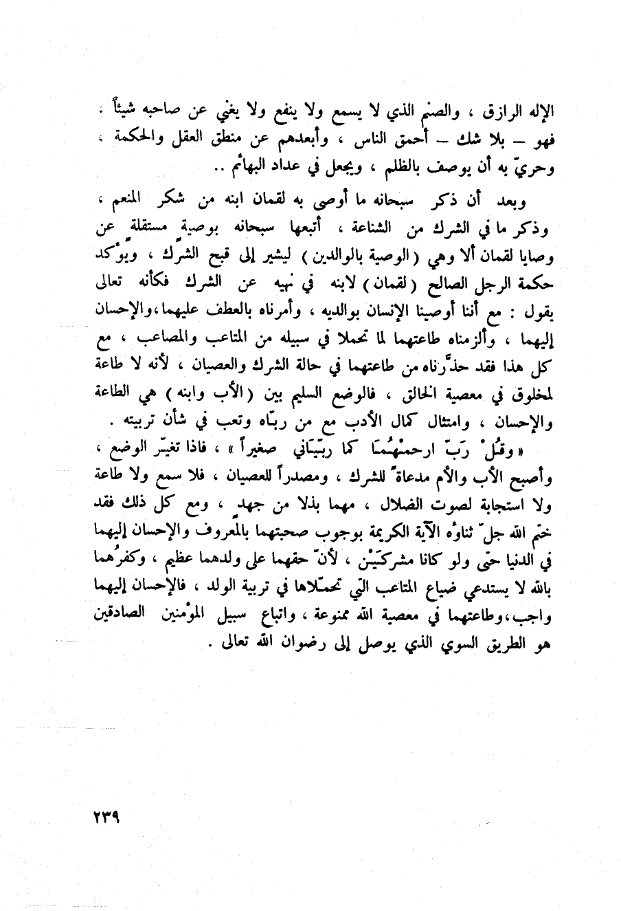 {وَقُل رَّبِّ ارحمهما كَمَا رَبَّيَانِي صَغِيراً} [الإسراء: 24] فإذا تغيّر الوضع، وأصبح الأب والأم مدعاةً للشرك، ومصدراً للعصيان، فلا سمع ولا طاعة ولا استجابة لصوت الضلال، مهما بذلا من جهدٍ، ومع كل ذلك فقد ختم الله جلّ ثناؤه الآية الكريمة بوجوب صحبتهما بالمعروف والإحسان إليهما في الدنيا حتى ولو كانا مشركَيْن، لأنّ حقهما على ولدهما عظيم، وكفرُهما بالله لا يستدعي ضياع المتاعب التي تحمّلاها في تربية الولد، فالإحسان إليهما واجب، وطاعتهما في معصية الله ممنوعة، واتباع سبيل المؤمنين الصادقين هو الطريق السوي الذي يوصل إلى رضوان الله تعالى.