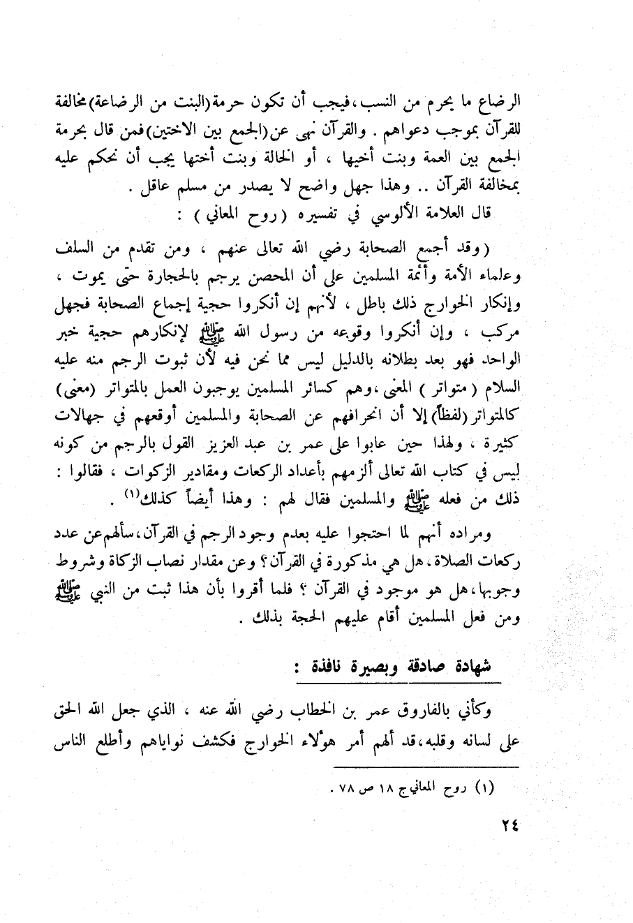 ومراده أنهم لما احتجوا عليه بعدم وجود الرجم في القرآن، سألهم عن عدد ركعات الصلاة، هل هي مذكورة في القرآن؟ مقدار نصاب الزكاة وشروط وجوبها، هل هو موجود في القرآن؟ فلما أقروا بأن هذا ثبت من النبي صَلَّى اللَّهُ عَلَيْهِ وَسَلَّم َ ومن فعل المسلمين أقام عليهم الحجة بذلك.
