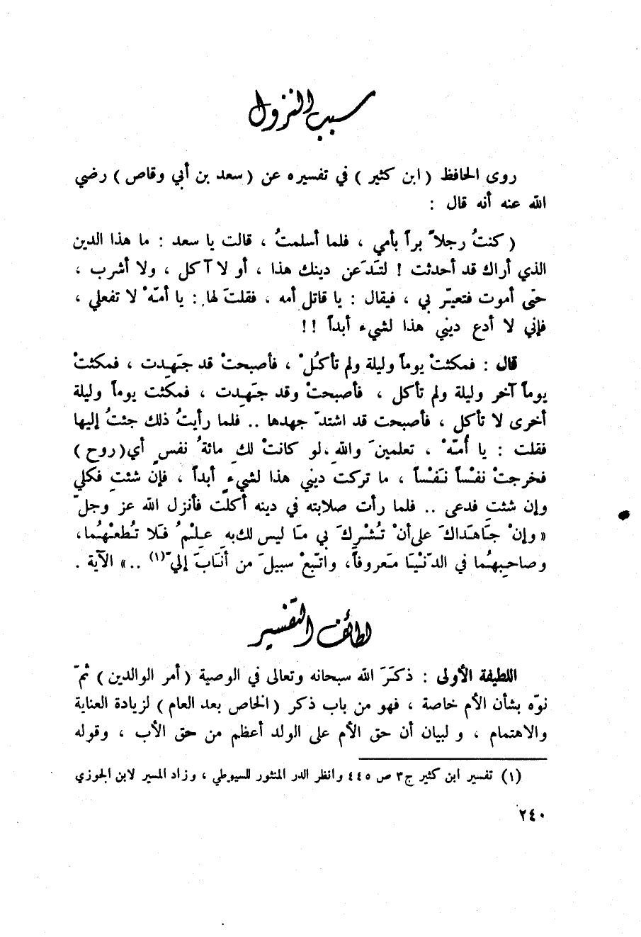 روى الحافظ (ابن كثير) في تفسيره عن (سعد بن أبي وقاص) رَضِيَ اللَّهُ عَنْه أنه قال: (كنتُ رجلاً براً بأمي، فلما أسلمتُ، قالت يا سعد: ما هاذ الدين الذي أراك قد أحدثت {لتَدَعن دينك هذا، أو لا آكل، ولا أشرب، حتى أموت فتعيّر بي، فيقال: يا قاتل أمه، فقلتَ لها: يا أمّهْ لا تفعلي، فإني لا أدع ديني هذا لشيء أبداً) } !