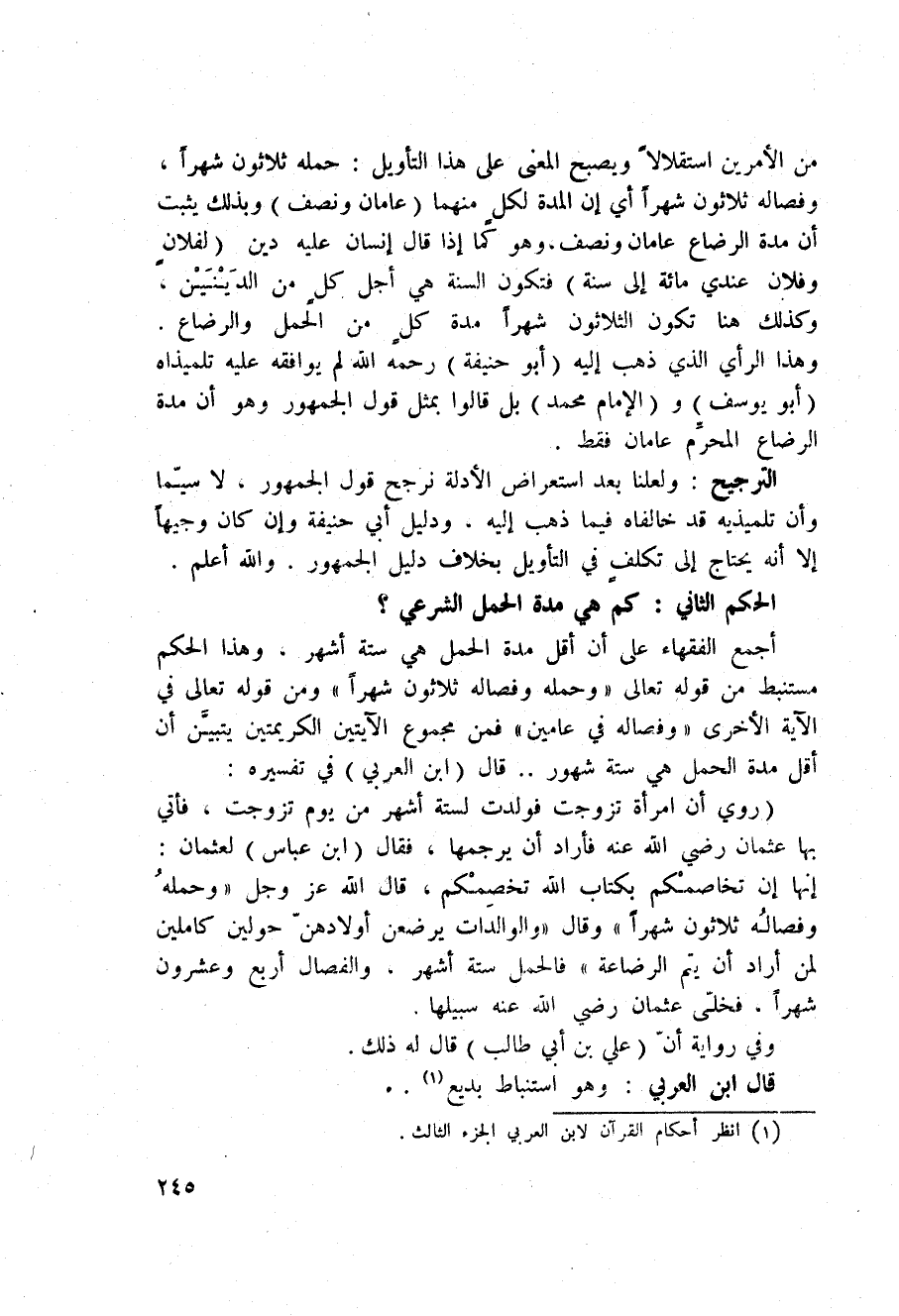 من الأمرين استقلالاً ويصبح المعنى على هذا التأويل: حملة ثلاثون شهراً، وفصاله ثلاثون شهراً أي إن المدة لكلٍ منهما (عامان ونصف) وبذلك يثبت أن مدة الرضاع عامان ونصف، وهو كما إذا قال إنسان عليه دين (لفلانٍ وفلان عندي مائة إلى سنة) فتكون السنة هي أجل كلٍ من الدَيْنَيْن، وكذلك هنا تكون الثلاثون شهراً مدة كلٍ من الحمل والرضاع. وهذا الرأي الذي ذهب إليه (أبو حنيفة) رحمة الله لم يوافقه عليه تلميذاه (أبو يوسف) و (الإمام محمد) بل قالوا بمثل قول الجمهور وهو أن مدة الرضاع المحرِّم عامان فقط.