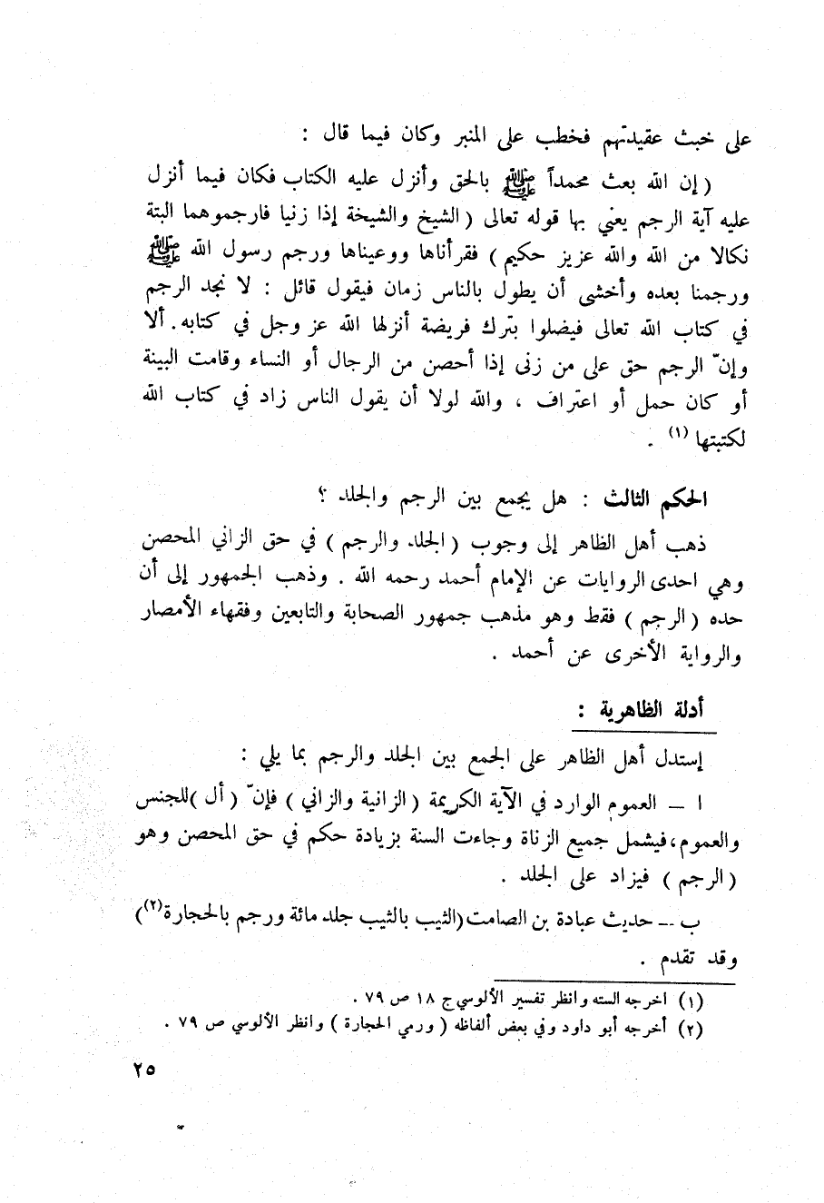 ذهب أهل الظاهر إلى وجوب (الجلد والرجم) في حق الزاني المحصن وهي إحدى الروايات عن الإمام أحمد رَحِمَهُ اللَّهُ. وذهب الجمهور إلى أن حده (الرجم) فقط وهو مذهب جمهور الصحابة والتابعين وفقهاء الأمصار والرواية الأخرى عن أحمد.