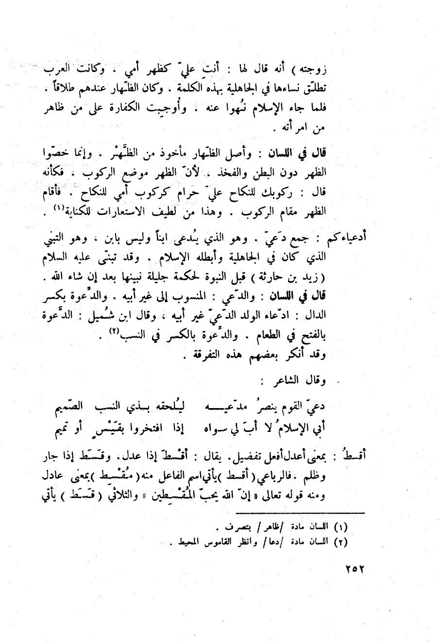 زوجته) أنه قال لها: أنتِ عليّ كظهر أمي، وكانت العرب تطلّق نساءها في الجاهلية بهذه الكلمة، وكان الظّهار عندهم طلاقاً، فلما جاء الإسلام نُهوا عنه، وأُوجِبت الكفارة على من ظاهر من امرأته.