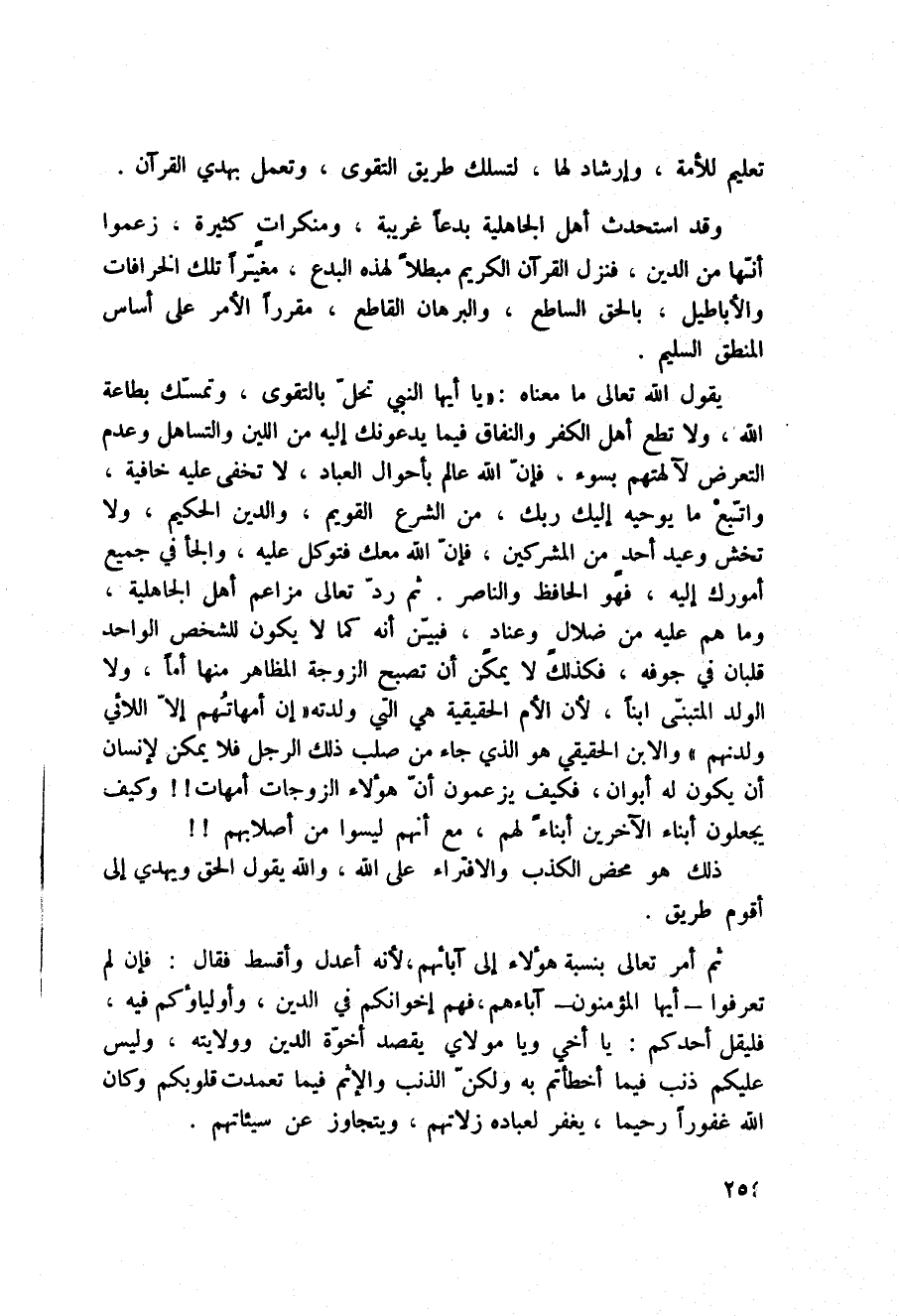 يقول الله تعالى ما معناه: «يا أيها النبي تحل بالتقوى، وتمسّك بطاعة الله، ولا تطع أهل الكفر والنفاق فيما يدعونك إليه من اللين والتساهل وعدم التعرض لآلهتهم بسوء، فإنّ الله عالم بأحوال العباد، لا تخفى عليه خافية، واتّبْع ما يوحيه إليك ربك، من الشرع القويم، والدين الحكيم، ولا تخش وعيد أحدٍ من المشركين، فإنّ الله معك فتوكل عليه، والجأ في جميع أمورك إليه، فهو الحافظ والناصر. ثم ردّ تعالى مزاعم أهل الجاهلية، وما هم عليه من ضلالٍ وعنادٍ، فبيّن أنه كما لا يكون للشخص الواحد قلبان في جوفه، فكذلك لا يمكن أن تصبح الزوجة المظاهر منها أماً، ولا الولد المتبنّى ابناً، لأن الأم الحقيقية هي التي ولدته {إِنْ أُمَّهَاتُهُمْ إِلاَّ اللائي وَلَدْنَهُمْ} [المجادلة: 2] والابن الحقيقي هو الذي جاء من صلب ذلك الرجل فلا يمكن لإنسان أن يكون له أبوان، فكيف يزعمون أنّ هؤلاء الزوجات أمهات! {وكيف يجعلون أبناء الآخرين أبناءً لهم، مع أنهم ليسوا من أصلابهم} !