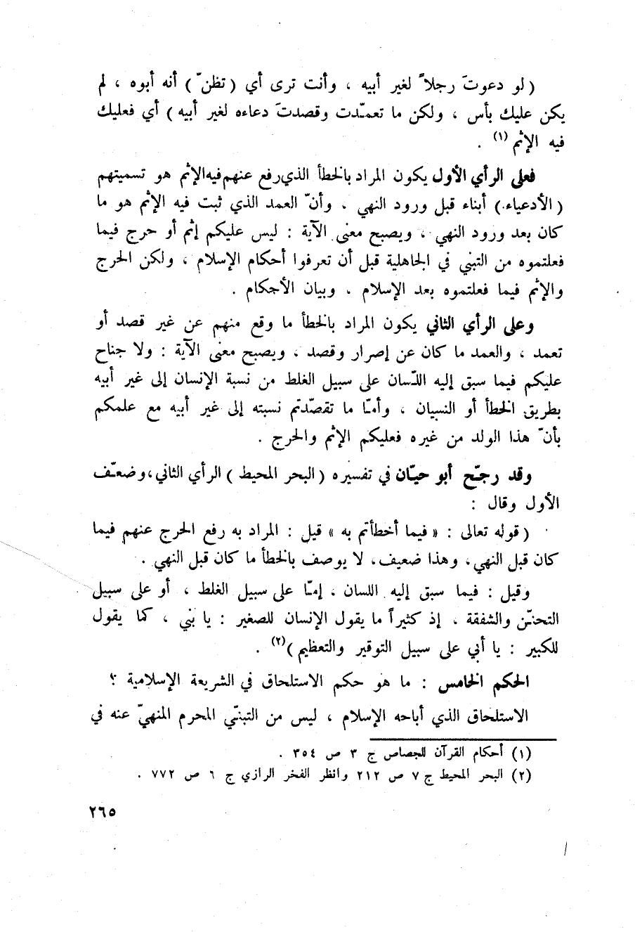 فعلى الرأي الأول يكون المراد بالخطأ الذي رفع عنهم فيه الإثم هو تسميتهم (الأدعياء) أبناء قبل ورود النهي. وأنّ العمد الذي ثبت فيه الإثم هو ما كان بعد ورود النهي، ويصبح معنى الآية: ليس عليكم إثم أو حرج فيما فعلتموه بعد الإسلام، وبيان الأحكام.