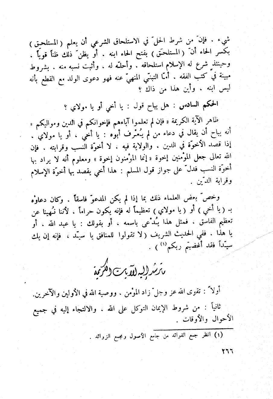 ظاهر الآية الكريمة {فَإِن لَّمْ تعلموا آبَاءَهُمْ فإخوانكم فِي الدين ومواليكم} أنه يباح أن يقال في دعاء من لم يُعْرف أبوه: يا أخي، أو يا مولاي، إذا قصد الأخوّة في الدين، والولاية فيه، لا أخوّة النسب وقرابته، فإن الله تعالى جعل المؤمنين إخوة {إِنَّمَا المؤمنون إِخْوَةٌ} [الحجرات: 10] ومعلوم أنه لا يراد بها أخوّة النسب فدلّ على جواز قول المسلم: هذا أخي يقصد بها أخوّة الإسلام وقرابة الدّين.