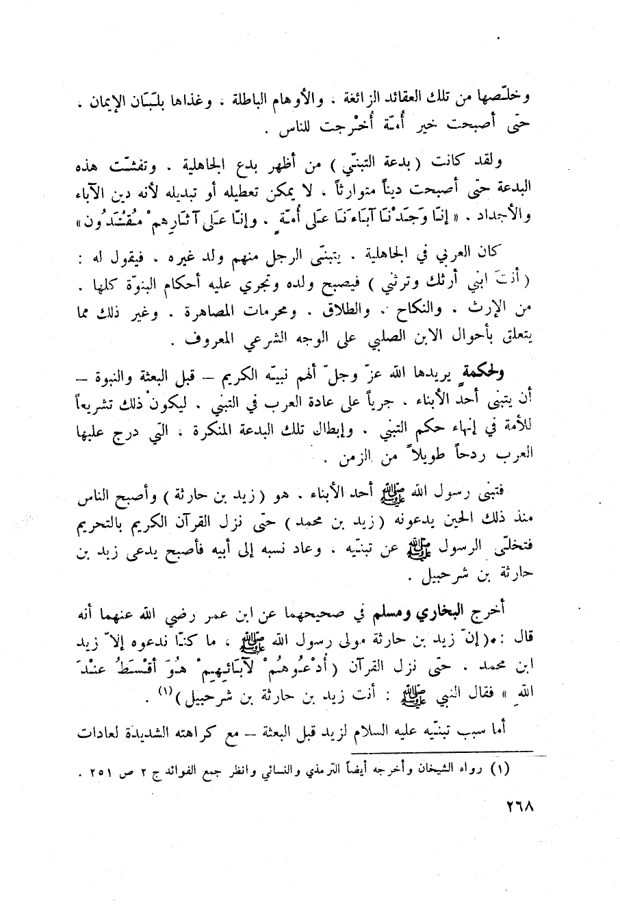 أخرج البخاري ومسلم في «صحيحهما» عن ابن عمر رَضِيَ اللَّهُ عَنْهما أنه قال: «إنّ زيد بن حارثة، مولى رسول الله صَلَّى اللَّهُ عَلَيْهِ وَسَلَّم َ. ما كنّا ندعوه إلاّ زيد بن محمد، حتى نزل القرآن {ادعوهم لآبَآئِهِمْ هُوَ أَقْسَطُ عِندَ الله} فقال النبي صَلَّى اللَّهُ عَلَيْهِ وَسَلَّم َ: أنت زيد بن حارثة بن شرحبيل» .