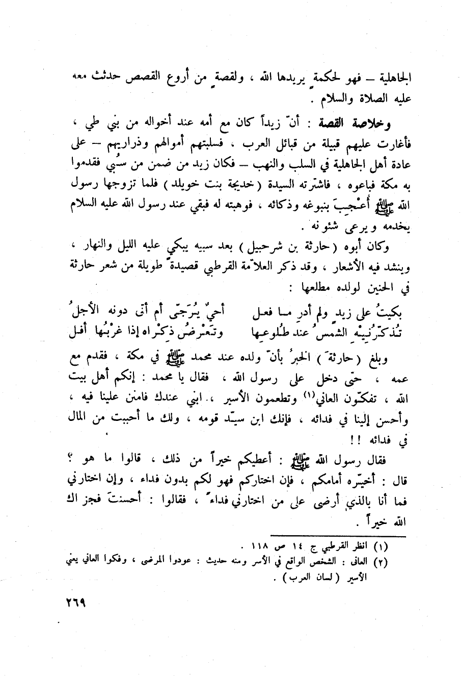وخلاصة القصة: أنّ زيداً كان مع أمه عند أخواله من بني طي، فأغارت عليهم قبيلة من قبائل العرب، فسلبتهم أموالهم وذراريهم - على عادة أهل الجاهلية في السلب والنهب - فكان زيد من ضمن من سُبي فقدموا به مكة فباعوه، فاشترته السيدة (خديجة بنت خويلد) فلما تزوجها رسول الله صَلَّى اللَّهُ عَلَيْهِ وَسَلَّم َ أُعْجِبَ بنبوغه وذكائه، فوهبته له فبقي عند رسول الله عليه السلام يخدمه ويرعى شؤونه.