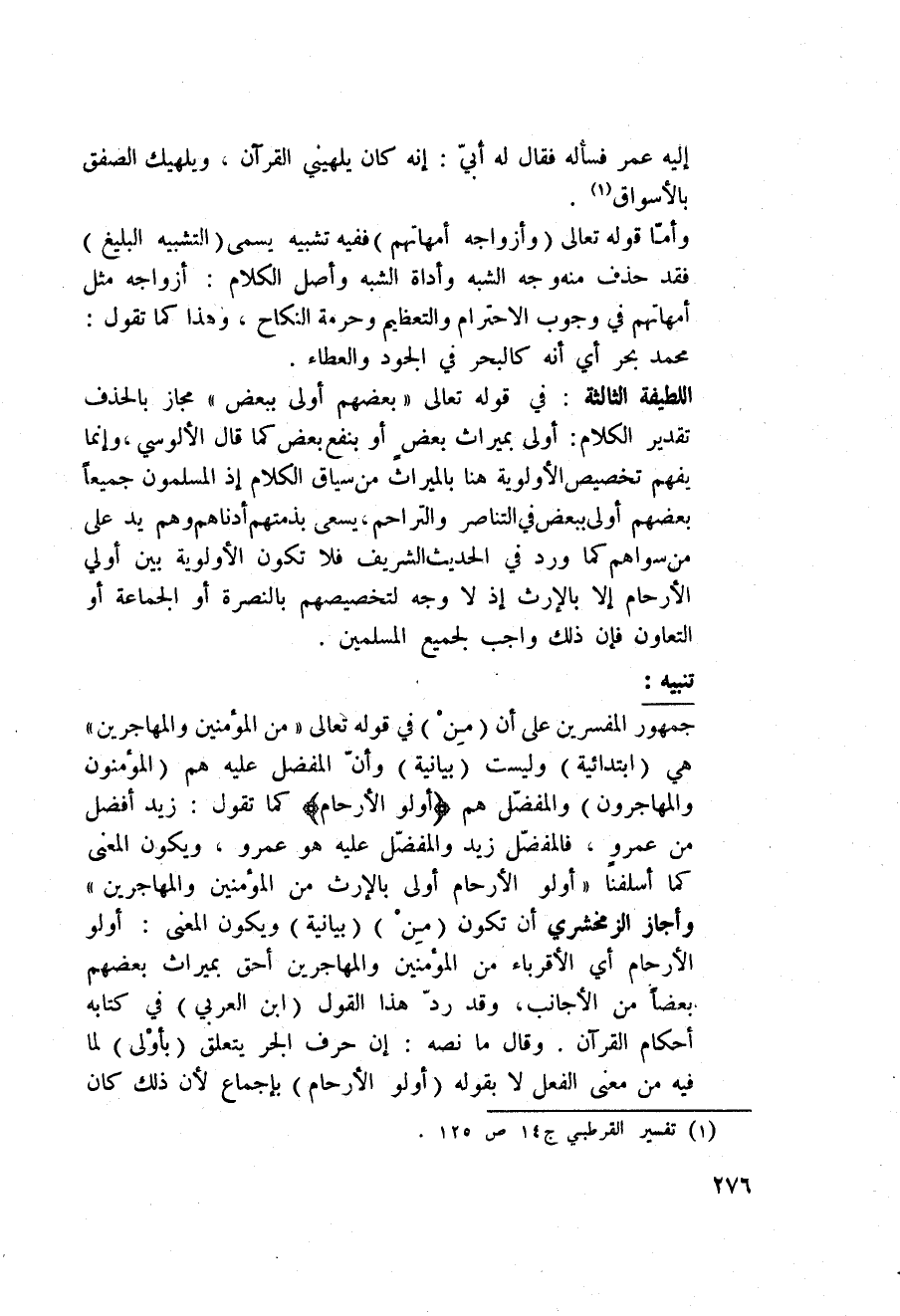 وأجاز الزمخشري أن تكون (مِنْ) (بيانية) ويكون المعنى: أولو الأرحام أي الأقرباء من المؤمنين والمهاجرين أحق بميراث بعضهم بعضاً من الأجانب، وقد ردّ هذا القول (ابن العربي) في كتابه «أحكام القرآن» . وقال ما نصه: إن حرف الجر يتعلق (بأوْلى) لما فيه من معنى الفعل لا بقوله (أولو الأرحام) بإجماع لأن ذلك كان