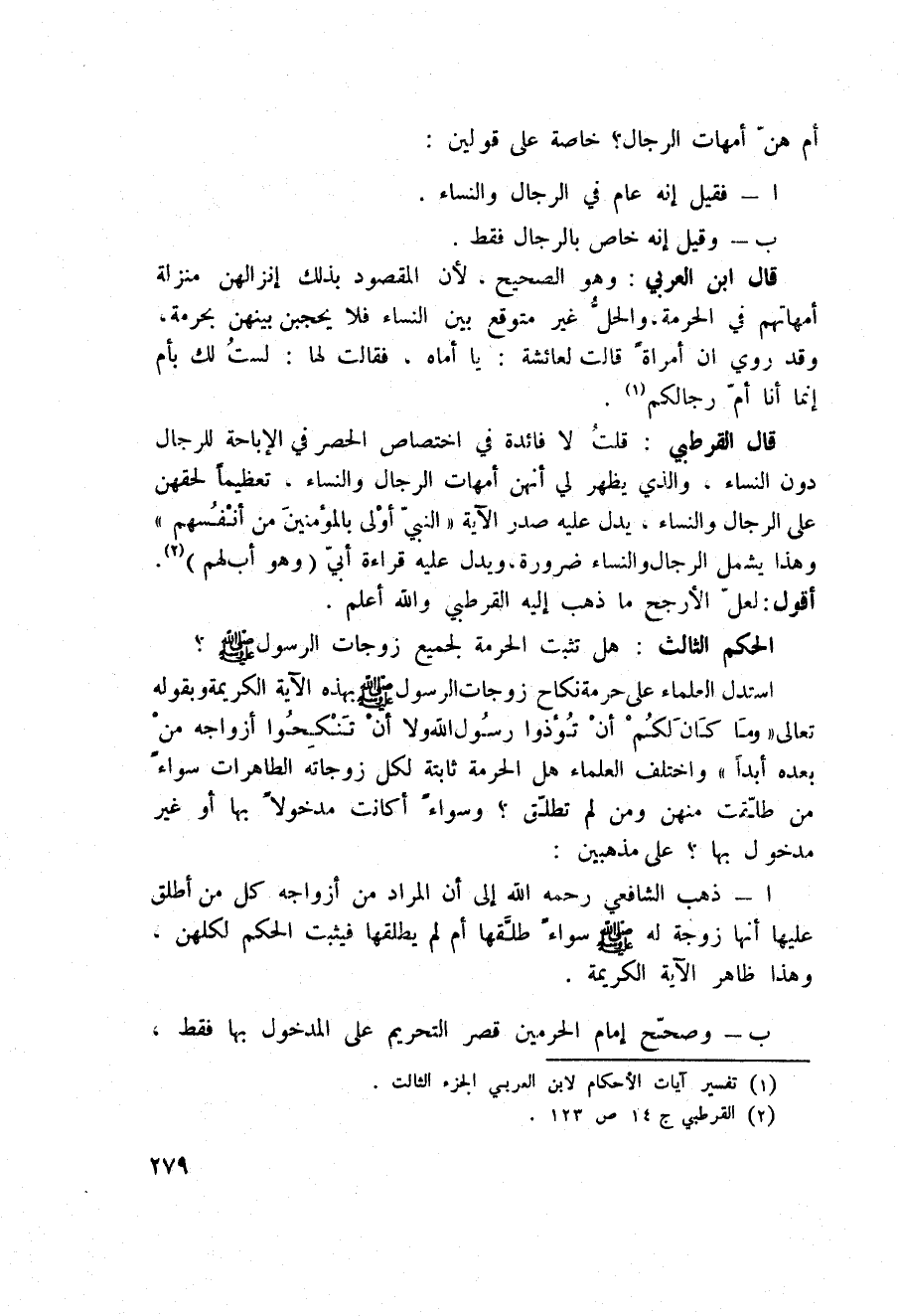 أ - ذهب الشافعي رَحِمَهُ اللَّهُ إلى أن المراد من أزواجه كل من أطلق عليها أنها زوجة له صَلَّى اللَّهُ عَلَيْهِ وَسَلَّم َ سواءً طلَّقها أم لم يطلقها فيثبت الحكم لكلهن، وهذا ظاهر الآية الكريمة.