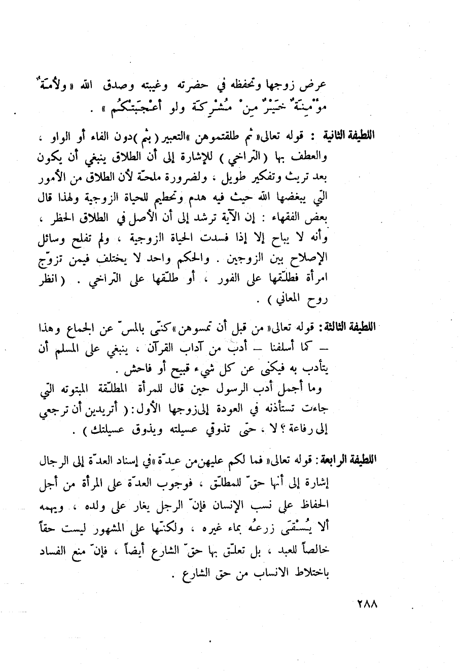 وما أجمل أدب الرسول حين قال للمرأة المطلّقة المبتوتة التي جاءت تستأذنه في العودة إلى زوجها الأول: «أتريدين أن ترجعي إلى رفاعة؟ لا، حتى تذوقي عسيلته ويذوق عسيلتك» . اللطيفة الرابعة: قوله تعالى: {فَمَا لَكُمْ عَلَيْهِنَّ مِنْ عِدَّةٍ} في إسناد العدّة إلى الرجال إشارة إلى أنها حقّ للمطلّق، فوجوب العدّة على المرأة من أجل الحفاظ على نسب الإنسان فإنّ الرجل يغار على ولده، ويهمه ألا يُسْقَى زرعُه بماء غيره، ولكنّها على المشهور ليست حقاً خالصاً للعبد، بل تعلّق بها حقّ الشارع أيضاً، فإن منع الفساد باختلاط الانساب من حق الشارع.