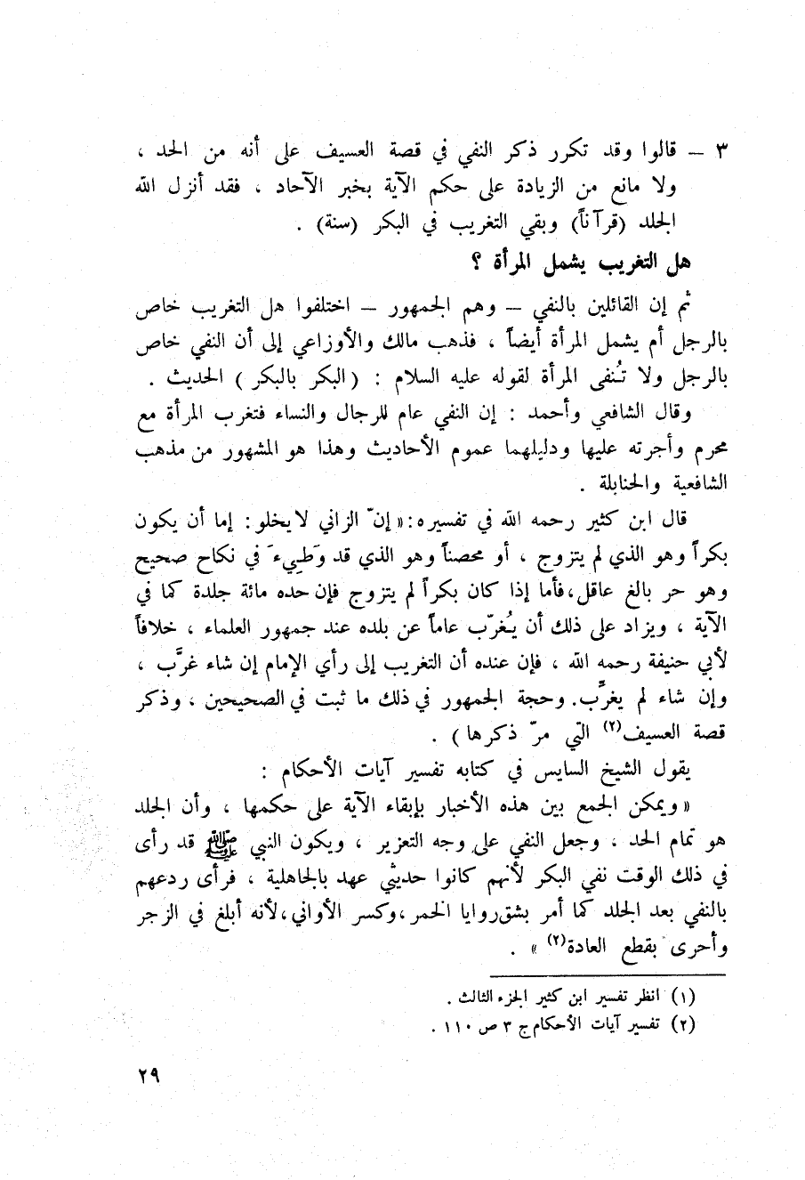 3 - قالوا وقد تكرر ذكر النفي في قصة العسيف على أنه من الحد، ولا مانع من الزياة عل حكم الآية بخبر الآحاد، فقد أنزل الله الجلد (قرآناً) وبقي التغريب في البكر (سنة) .