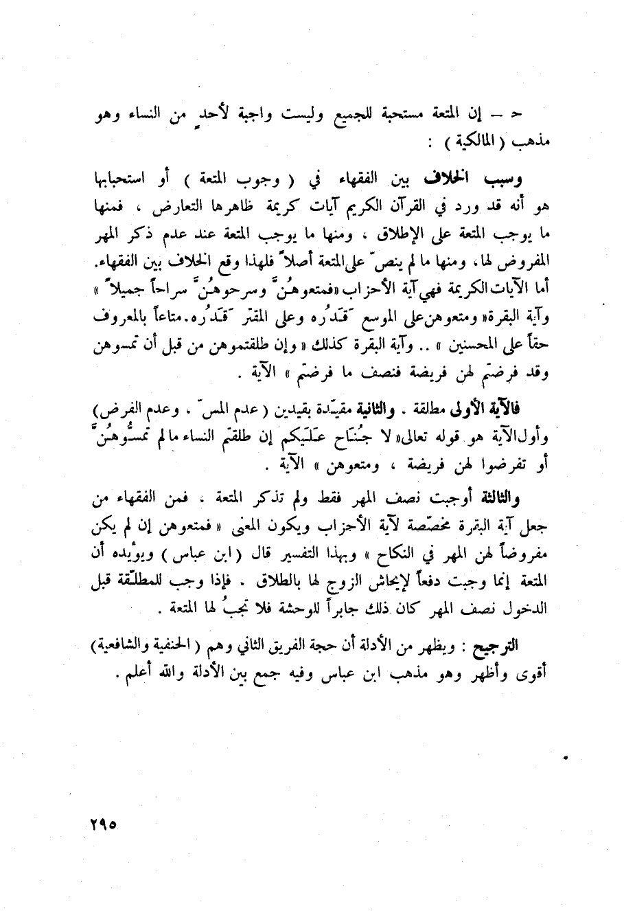 والثالثة أوجبت نصف المهر فقط ولم تذكر المتعة، فمن الفقهاء من جعل آية البقرة مخصّصة لآية الأحزاب ويكون المعنى (فمتعوهن إن لم يكن مفروضاً لهن المهر في النكاح) وبهذا التفسير قال (ابن عباس) ويؤيده أن المتعة إنما وجبت دفعاً لإيحاش الزوج لها بالطلاق، فإذا وجب للمطلّقة قبل الدخول نصف المهر كان ذلك جابراً للوحشة فلا تجبُ لها المتعة.