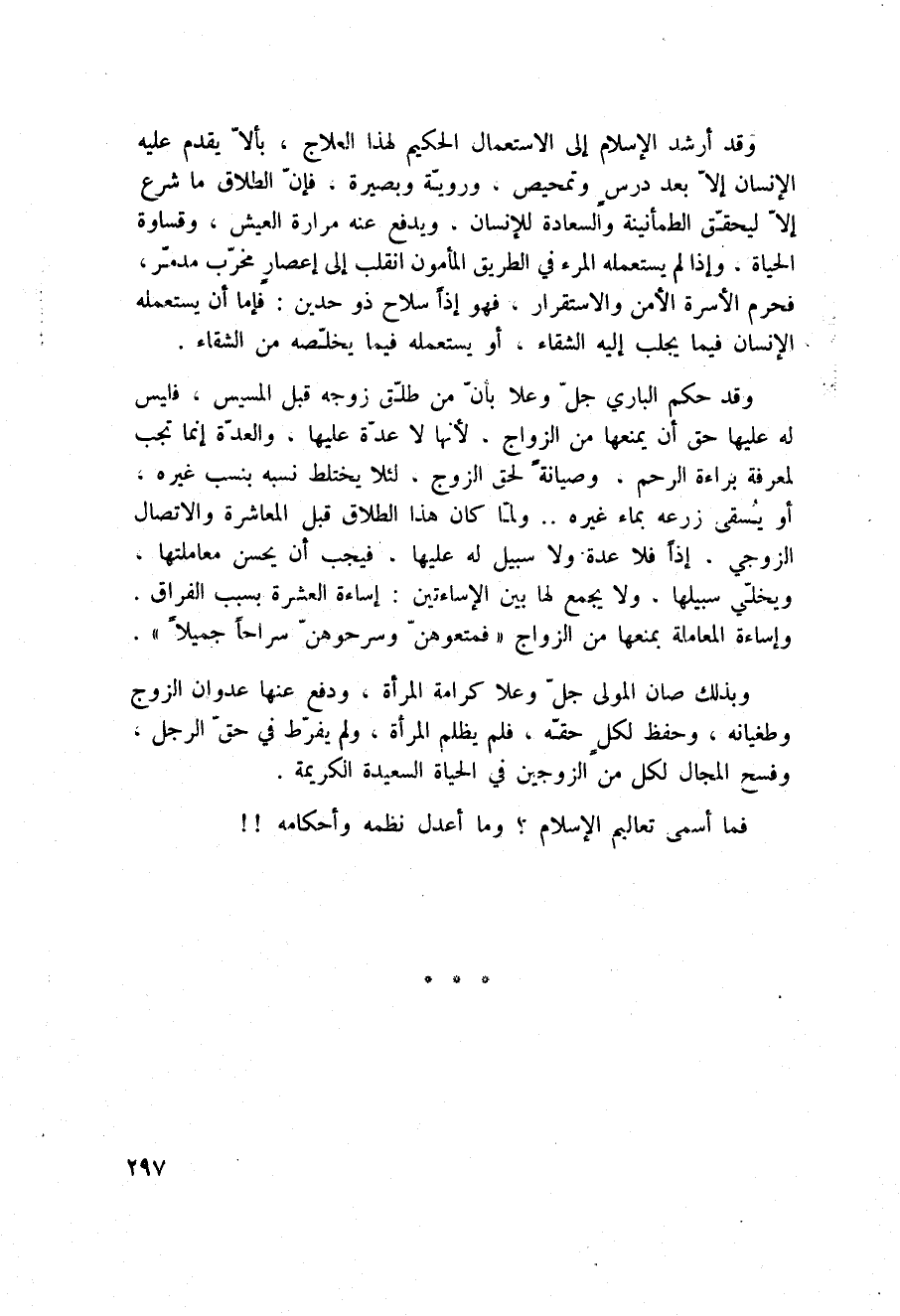 وبذلك صان المولى جلّ وعلا كرامة المرأة، ودفع عنها عدوان الزوج وطغيانه، وحفظ لكلٍ حقّه، فلم يظلم المرأة، ولم يفرّط في حقّ الرجل، وفسح المجال لكل من الزوجين في الحياة السعيدة الكريمة.