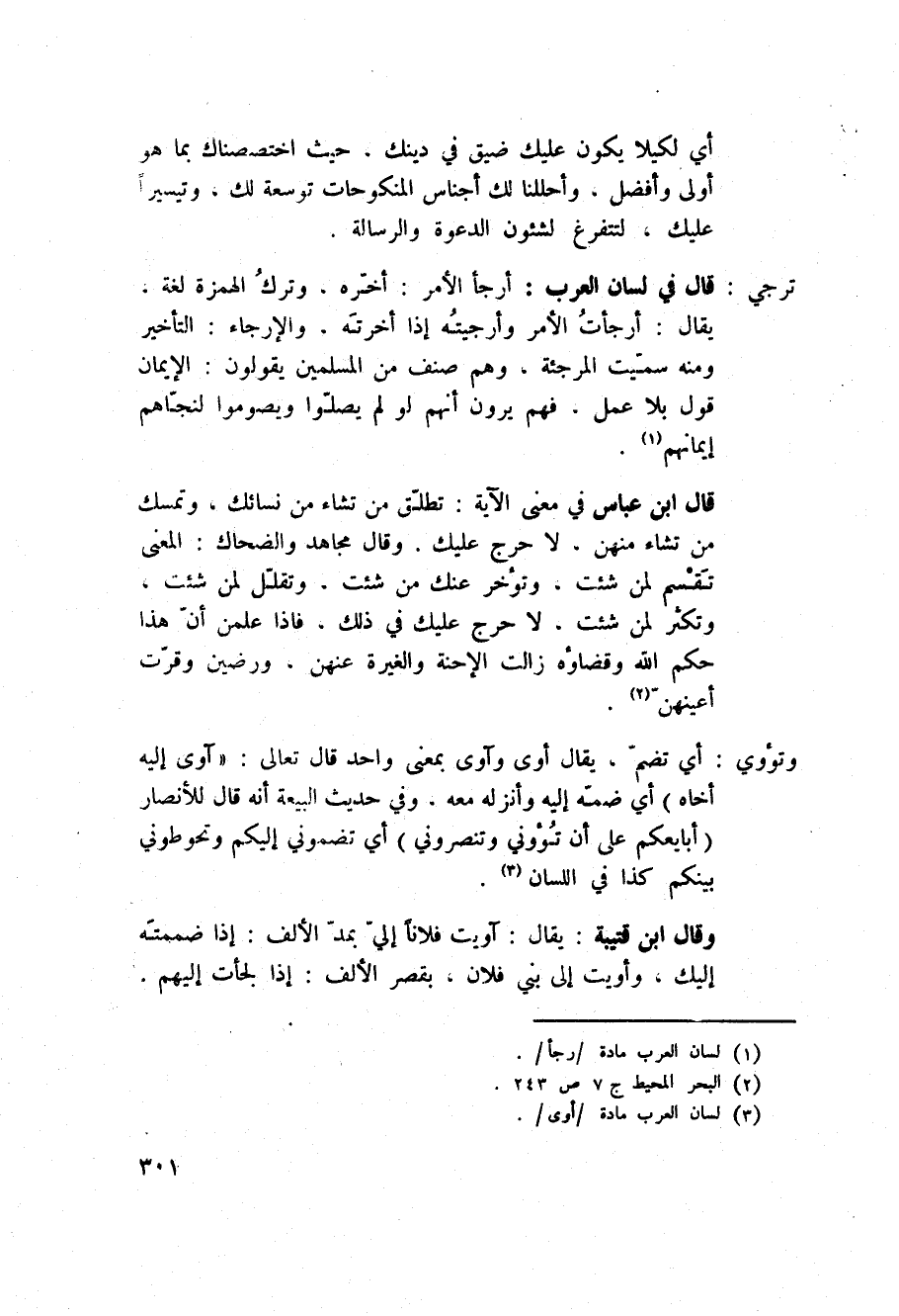 {تُرْجِي} : قال في «لسان العرب» : أرجأ الأمر: أخّره، وتركُ الهمزة لغة، يقال: أرجأتُ الأمر وأرجيتُه إذا أخرتَه، والإرجاء: التأخير ومنه سمّيت المرجئة، وهم صنف من المسلمين يقولون: الإيمان قول بلا عمل، فهم يرون أنهم لم لم يصلّوا ويصوموا لنجّاهم إيمانهم.