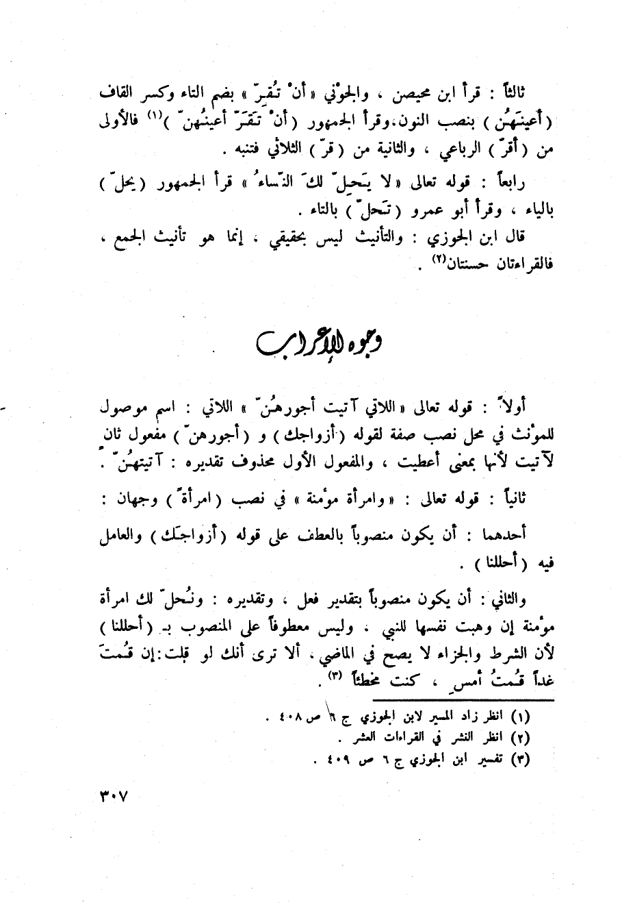 ثالثاً: قرأ ابن محيصن، والجوْني {أنْ تُقِرّ} بضم التاء وكسر القاف {أعينَهُن} بنصب النون، وقرأ الجمهور {أنْ تَقَرّ أعينُهنّ} فالأولى من (أقرّ) الرباعي، والثانية من (قرّ) الثلاثي فتنبه.