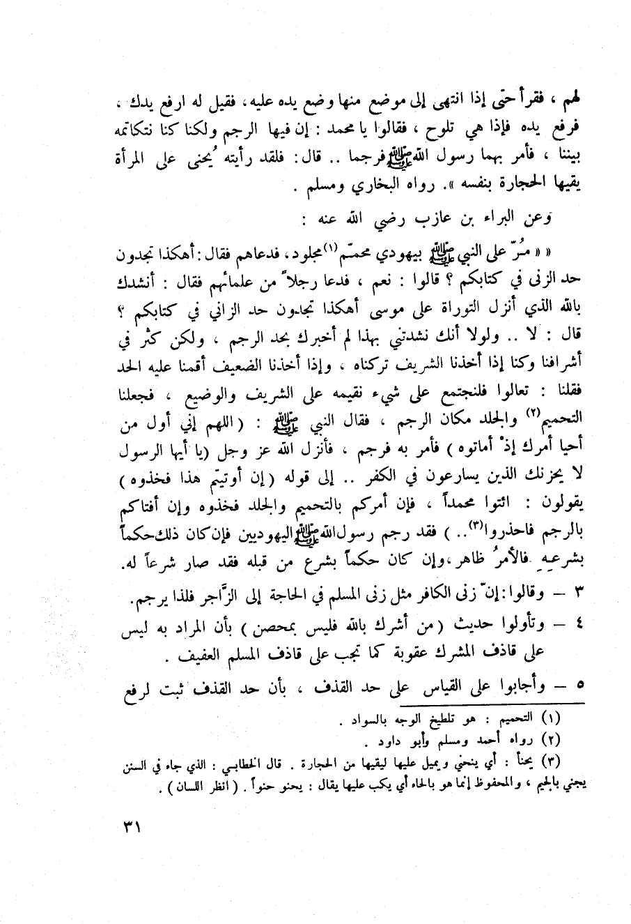 وعن البراء بن عازب رَضِيَ اللَّهُ عَنْه:» مُرّ على النبي صَلَّى اللَّهُ عَلَيْهِ وَسَلَّم َ بيهودي محمّم مجلود، فدعاهم فقال: أهكذا تجدون حد الزنى في كتابكم؟ قالوا: نعم، فدعا رجلاً من علمائهم فقال: أنشدك بالله الذي أنزل التوراة على موسى أهكذا تجدون حد الزاني في كتابكم؟ قال: لا. . ولولا أنك نشدتني بهذا لم أخبرك بحد الرجم، ولكن كثر في أشرافنا وكنا إذا أخذنا الشريف تركناه، وإذا أخذنا الضعيف أقمنا عليه الحد فقلنا: تعالوا فلنجتمع على شيء نقيمه على الشريف والوضيع، فجعلنا التحميم والجلد مكان الرجم، فقال النبي صَلَّى اللَّهُ عَلَيْهِ وَسَلَّم َ: «اللهم إني أول من أحيا أمرك إذْ أماتوه» «