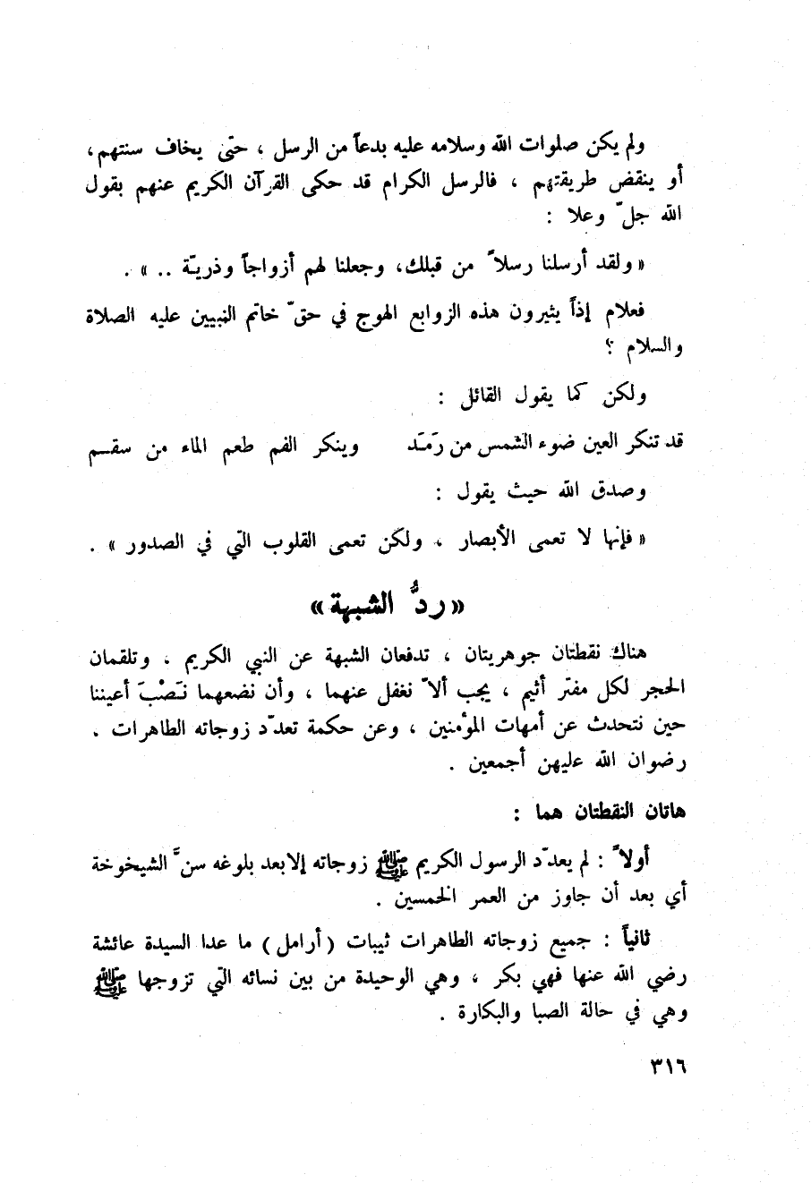 هناك نقطتان جوهريتان، تدفعان الشبهة عن النبي الكريم، وتلقمان الحجر لكل مقتر أثيم، يجب ألاّ يغفل عنهما، وأن نضعهما نَصْبَ أعيننا حين نتحدث عن أمهات المؤمنين، وعن حكمة تعدّد زوجاته الطاهرات، رضوان الله عليهن أجمعين.