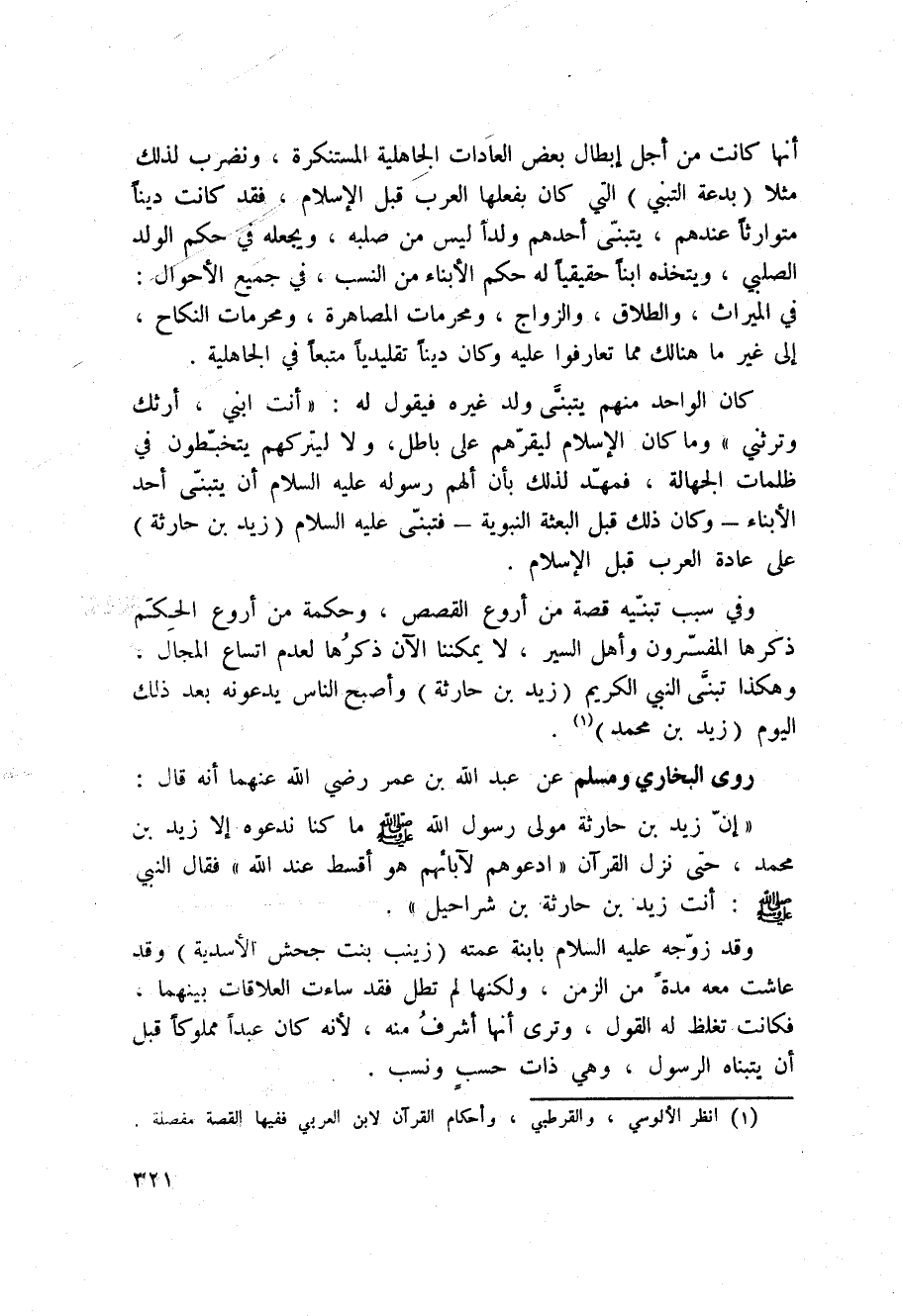 روى البخاري ومسلم: عن عبد الله بن عمر رَضِيَ اللَّهُ عَنْهما أنه قال: إنّ زيد بن حارثة مولى رسول الله صَلَّى اللَّهُ عَلَيْهِ وَسَلَّم َ ما كنّا ندعوه إلاّ زيد بن محمد، حتى نزل القرآن {ادعوهم لآبَآئِهِمْ هُوَ أَقْسَطُ عِندَ الله} [الأحزاب: 5] فقال النبي صَلَّى اللَّهُ عَلَيْهِ وَسَلَّم َ: أنت زيد بن حارثه بن شراحبيل «.