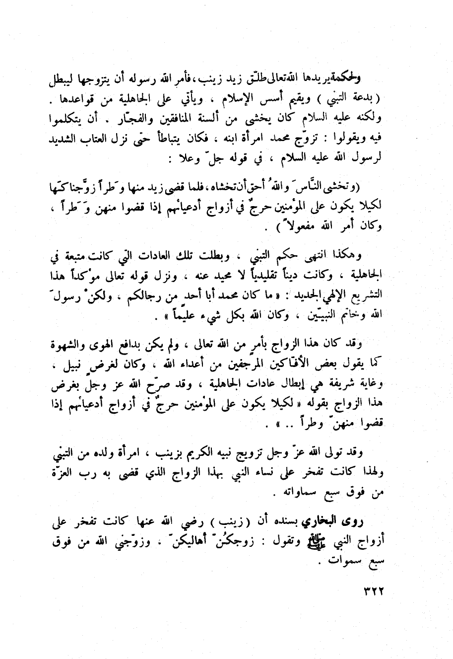 {وَتَخْشَى الناس والله أَحَقُّ أَن تَخْشَاهُ فَلَمَّا قضى زَيْدٌ مِّنْهَا وَطَراً زَوَّجْنَاكَهَا لِكَيْ لاَ يَكُونَ عَلَى المؤمنين حَرَجٌ في أَزْوَاجِ أَدْعِيَآئِهِمْ إِذَا قَضَوْاْ مِنْهُنَّ وَطَراً وَكَانَ أَمْرُ الله مَفْعُولاً}