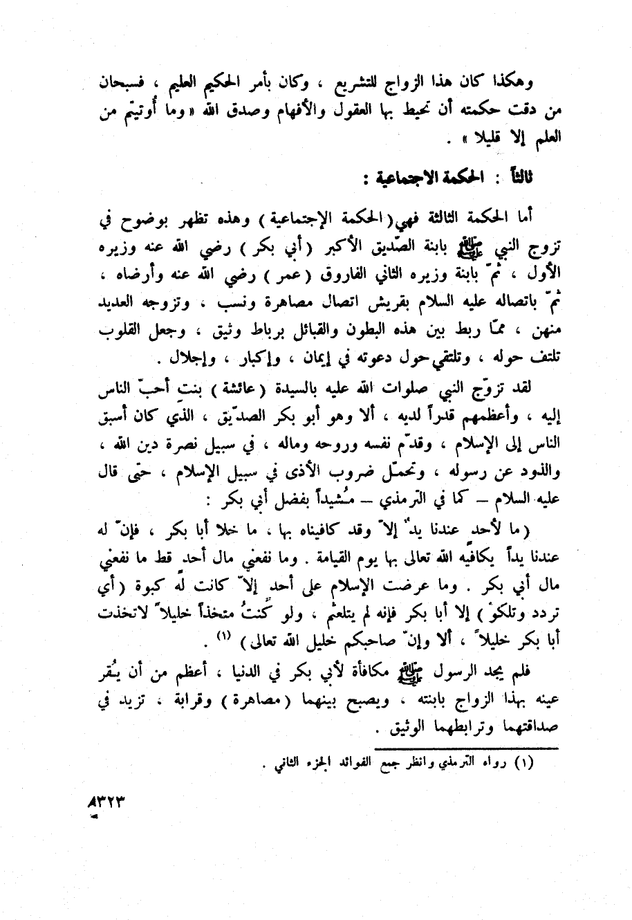 أما الحكمة الثالثة فهي (الحكمة الاجتماعية) وهذه تظهر بوضوح في تزوج النبي صَلَّى اللَّهُ عَلَيْهِ وَسَلَّم َ بابنة الصّديق الأكبر (أبي بكر) رَضِيَ اللَّهُ عَنْه وزيره الأول، ثمّ بابنة وزيره الثاني الفاروق (عمر) رَضِيَ اللَّهُ عَنْه وأرضاه، ثمّ باتصاله عليه السلام بقريش اتصال مصاهرة ونسب. وتزوجه العديد منهن، ممّا ربط بين هذه البطون والقبائل برباط وثيق، وجعل القلوب تلتف حوله، وتلتقي حول دعوته في إيمان، وإكبار، وإجلال.