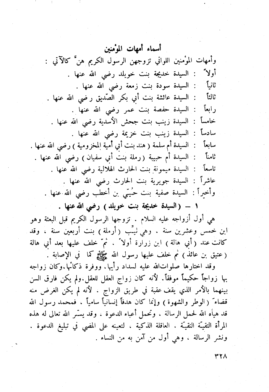 وأمهات المؤمنين اللواتي تزوجهن الرسول الكريم هنَّ كالآتي: