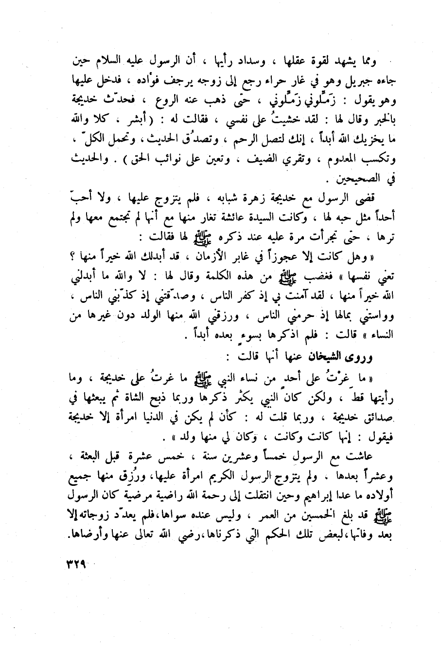 وروى الشيخان عنها أنها قالت: «ما غرْتُ على أحدٍ من نساء النبي صَلَّى اللَّهُ عَلَيْهِ وَسَلَّم َ ما عرتُ على خديجة، وما رأيتها قطَ، ولكن النبي يكثر ذكرها وربما ذبح الشاة ثم يبعثها في صدائق خديجة، وربما قلت له: كأن لم يكن في الدنيا امرأة إلا خديجة فيقول:» إنها كانت وكانت، وكان لي منها ولد «.
