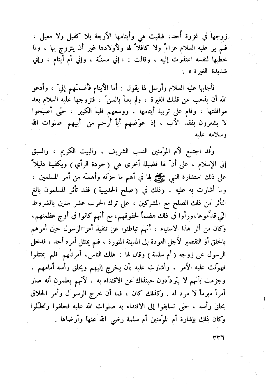وقد اجتمع لأم المؤمنين النسب الشريف، والبيت الكريم، والسبق إلى الإسلام، على أنّ لها فضيلة أخرى هي (جودة الرأي) ويكفينا دليلاً على ذلك استشارة النبي صَلَّى اللَّهُ عَلَيْهِ وَسَلَّم َ لها في أهم ما حزَنه وأهمّه من أمر المسلمين، وما أشارت به عليه، وذلك في (صلح الحديبية) فقد تأثر المسلمون بالغ التأثر من ذلك الصلح مع المشركين، على ترك الحرب عشر سنين بالشروط التي قدَّموها، ورأوا في ذلك هضماً لحقوقهم، مع أنهم كانوا ف يأوج عظمتهم، وكان من أثر هذا الاستياء، أنهم تباطئوا عن تنفيذ أمر الرسول حين أمرهم بالحلق أو التقصير لأجل العودة إلى المدينة المنورة، فلم يمتثل أمره أحد، فدخل الرسول على زوجه (أم سلمة) وقال لها هلك الناس، أمرتُهم فلم يمتثلوا فهوّنت عليه الأمر، وأشارت عليه بأن يخرج إليهم ويحلق رأسه أمامهم، وجزمت بأنهم لا يتردّدون حينذاك عن الاقتداء به.