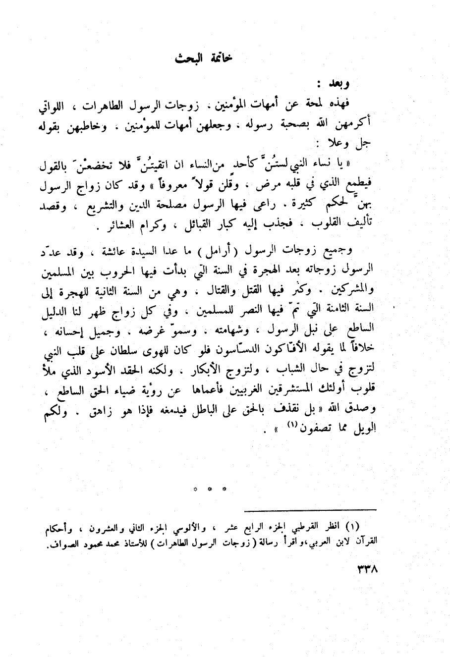 وجميع زوجات الرسول (أرامل) ما عدا السيدة عائشة، وقد عدّد الرسول زوجاته بعد الهجرة في السنة التي بدأت فيها الحروب بين المسلمين والمشركين، وكثر فيها القتل والقتال، وهي من السنة الثانية للهجرة إلى السنة الثامنة التي تمّ فيها النصر للمسلمين، وفي كل زواج ظهر لنا الدليل الساطع على نبل الرسول، وشهامته، وسموّ غرضه، وجميل إحسانه، خلافاً لما يقوله الأفّاكون الدسّاسون فلو كان للهوى سلطان على قلب النبي لتزوج في حال الشباب، رؤية ضياء الحق الساطع، وصدق الله: {بَلْ نَقْذِفُ بالحق عَلَى الباطل فَيَدْمَغُهُ فَإِذَا هُوَ زَاهِقٌ وَلَكُمُ الويل مِمَّا تَصِفُونَ} [الأنبياء: 18] .