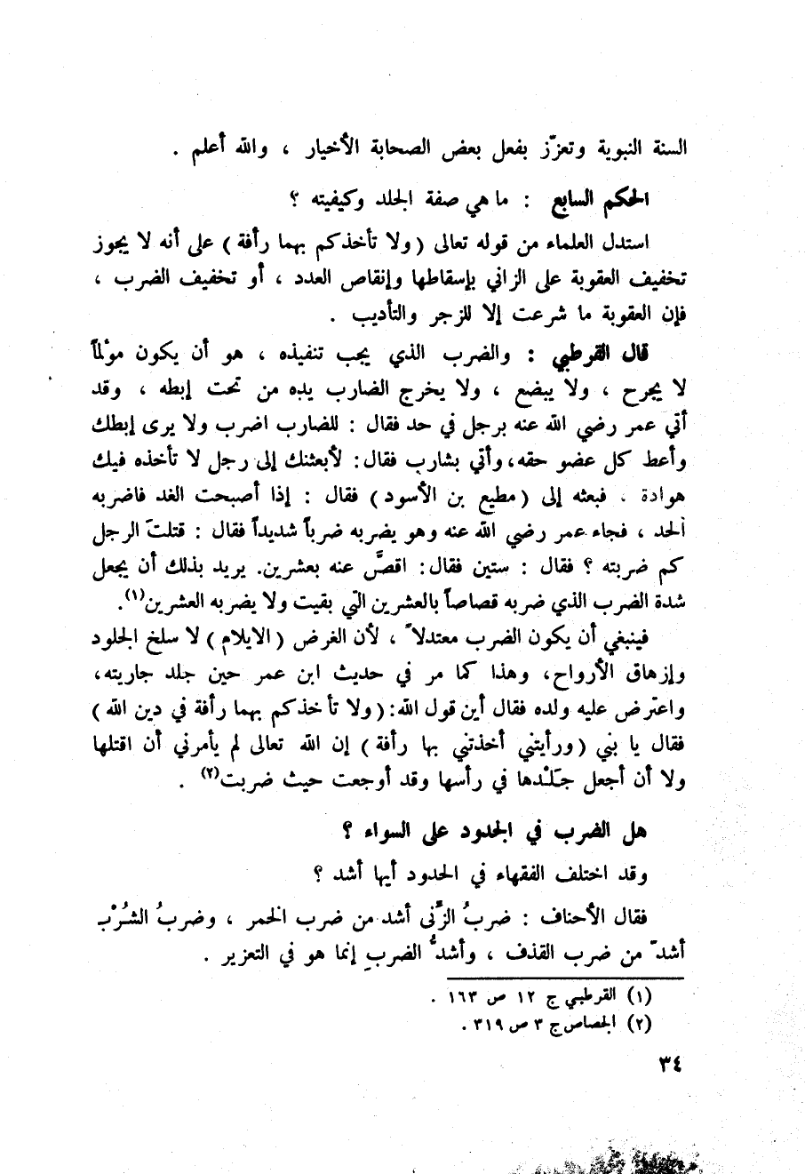 قال القرطبي: والضرب الذي يجب تنفيذه، هو أن يكون مؤلماً لا يجرح، ولا يبضع، ولا يخرج الضارب يده من تحت إبطه، وقد أتى عمر رَضِيَ اللَّهُ عَنْه برجل في حد فقال: للضارب اضرب ولا يرى إبطك وأعط كل عضو حقه، وأتي بشارب فقال: لأبعثنك إلى رجلا لا تأخذه فيك هوادة، فبعثه إلى (مطيع بن الأسود) فقال: إذا أصبحت الغد فاضربه الحد، فجاء عمر رَضِيَ اللَّهُ عَنْه وهو يضربه ضرباً شديداً فقال: قتلتَ الرجل كم ضربته؟ فقال: ستين فقال: اقصَّ عنه بعشرين. يريد بذلك أن يجعل شدة الضرب الذي ضربه قصاصاً بالعشرين التي بقيت ولا يضربه العشرين.