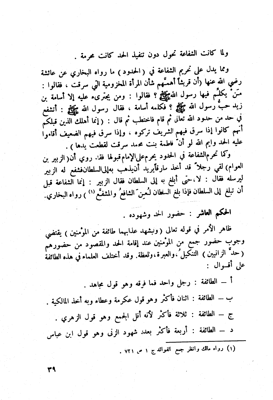 ومما يدل على تحريم الشفاعة في (الحدود) ما رواه البخاري عن عائشة رَضِيَ اللَّهُ عَنْها أن قريشاً أهمَّهم شأن المرأة المخزومية التي سرقت، فقالوا: مَنْ يكلِّم فيها رسول الله صَلَّى اللَّهُ عَلَيْهِ وَسَلَّم َ؟ فقالوا: ومن يجترئ عليه إلا أسامة بن زيد حبُّ رسول الله صَلَّى اللَّهُ عَلَيْهِ وَسَلَّم َ؟ فكلمه أسامة، فقال رسول الله صَلَّى اللَّهُ عَلَيْهِ وَسَلَّم َ: أتشفع في حد من حدود الله تعالى ثم قام فاختطب ثم قال: «إنما أهلك الذين من قبلكم أنهم كانوا إذا سرق فيهم الشريف تركوه، وإذا سرق فيهم الضعيف أقاموا عليه الحد وايم الله لو أنّ فاطمة بنت محمد سرقت لقطعت يدها» .