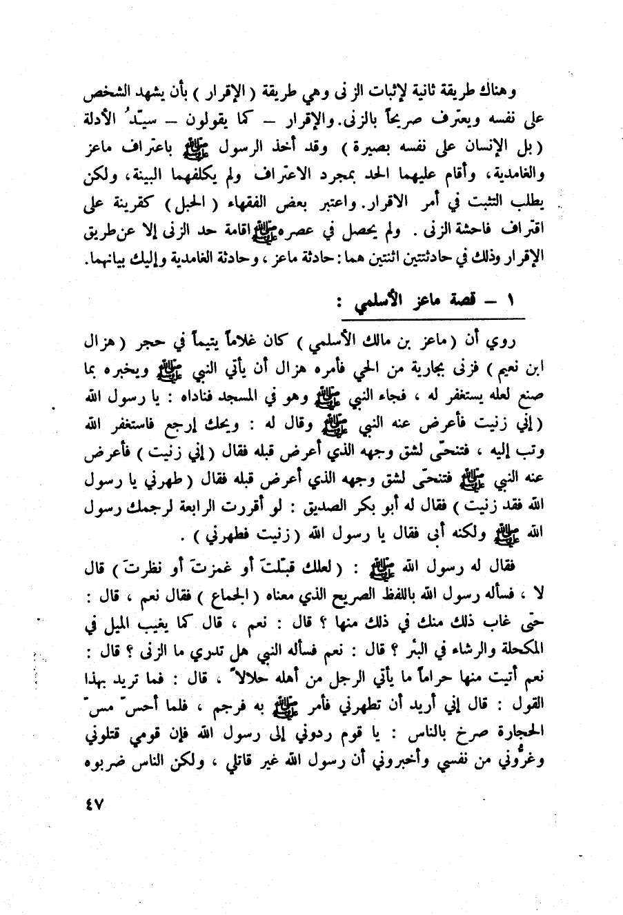 وري أن (ماعز بن مالك الأسلمي) كان غلاماً يتيماً في حجر (هزال بن نعيم) فزنى بجارية من الحي فأمره هزال أن يأتي النبي صَلَّى اللَّهُ عَلَيْهِ وَسَلَّم َ ويخبره بما صنع لعله يستغفر له، فجاء النبي صَلَّى اللَّهُ عَلَيْهِ وَسَلَّم َ وهو في المسجد فناداه: يا رسول الله (إني زنيت فأعرض عنه النبي صَلَّى اللَّهُ عَلَيْهِ وَسَلَّم َ وقال له: ويحك ارجع فاستغفر الله وتب إليه، فتنحّى لشق وجهه الذي أعرض قبله فقال (إني زنيت) فأعرض عنه النبي صَلَّى اللَّهُ عَلَيْهِ وَسَلَّم َ فتنحّى لشق وجهه الذي أعرض قبله فقال (طهرني يا رسول الله فقد زنيت) فقال له أبو بكر الصديق: لو أقررت الرابعة لرجمك رسول الله صَلَّى اللَّهُ عَلَيْهِ وَسَلَّم َ ولكنه أبى فقال يا رسول الله (زنيت فطهرني) .