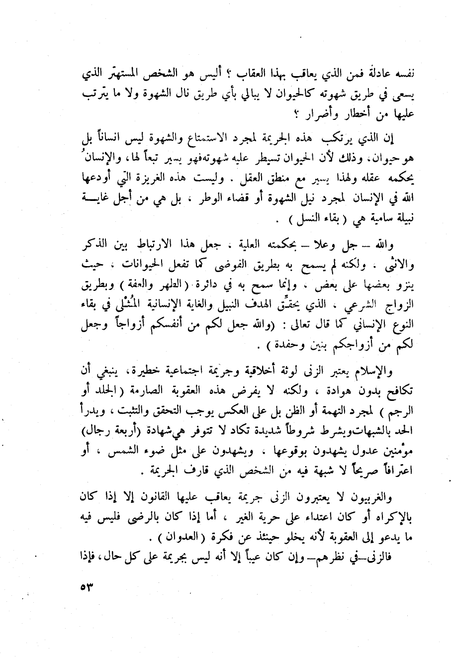 والإسلام يعتبر الزنى لوثه أخلاقية وجريمة اجتماعية خطيرة، ينبغي أن تكافح بدون هوادة، ولكنه لا يفرض هذه العقوبة الصارمة (الجلد أو الرجم) لمجرد التهمة أو الظن بل على العكس يودب التحقق والتثبت، ويدرأ الحد بالشبهات ويشرط شروطاً شديدة تكاد لا تتوفر هي شهادة (أربعة رجال) مؤمنين عدول يشهدون بوقوعها، ويشهدون على مثل ضوء الشمس، أو اعترافاً صريحاً لا شبهة فيه من الشخص الذي قارف الجريمة.