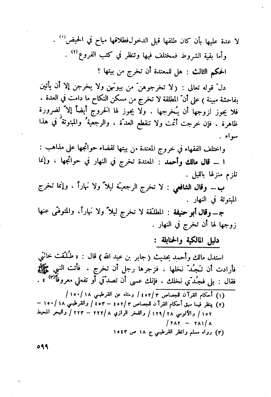 ج - وقال أبو حنيفة: المطلّقة لا تخرج ليلاً ولا نهاراً، والمتوفّى عنها زوجها لها أن تخرج في النهار.