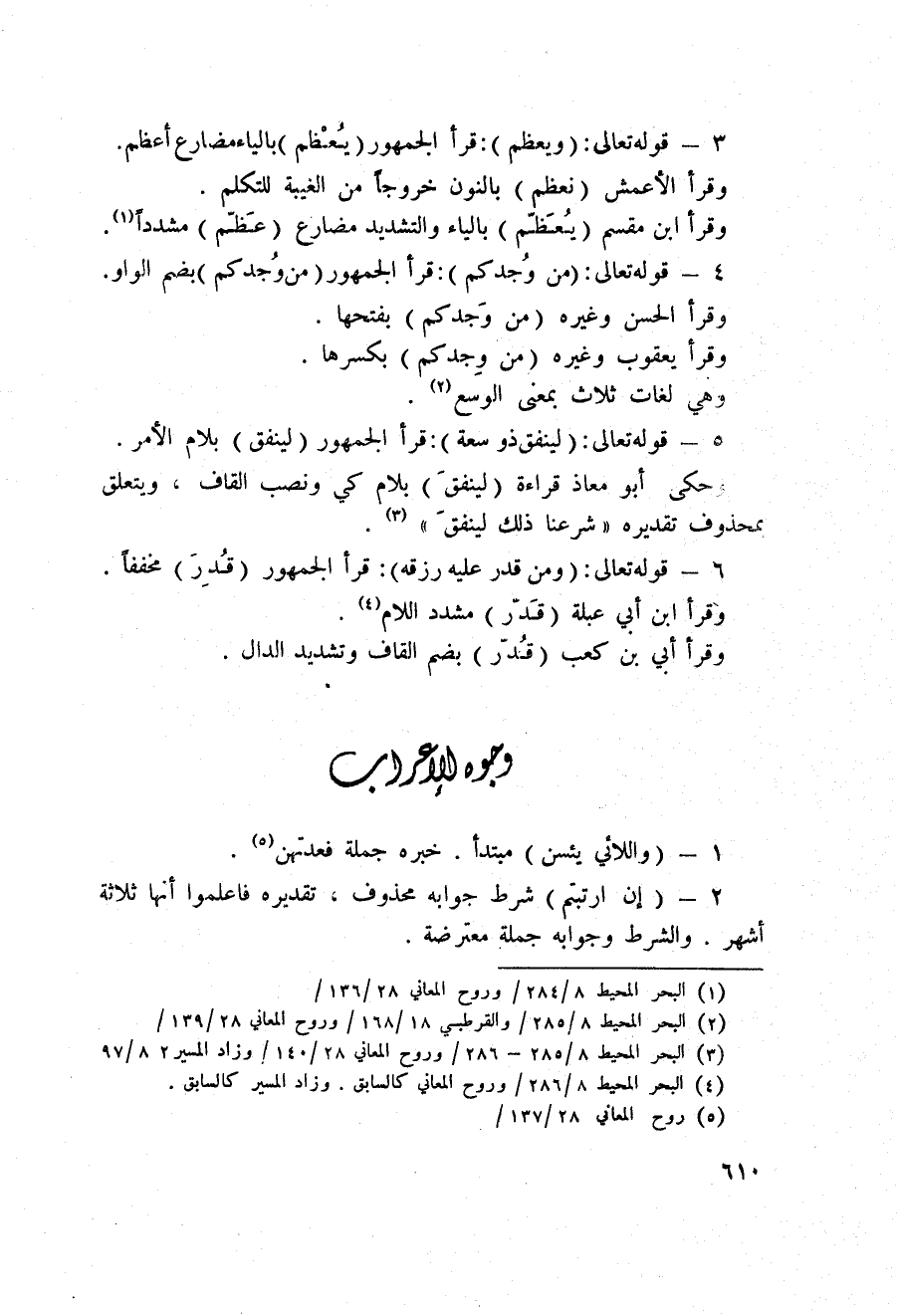 وقرأ ابن مقسم {يُعَظّم} بالياء والتشديد مضارع {عَظّم} مشدداً. 4 - قوله تعالى: {مِّن وُجْدِكُمْ} : قرأ الجمهور {من وُجدكم} بضم الواو. وقرأ الحسن وغيره {من وَجدكم} بفتحها.