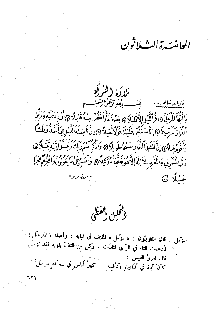 {المزمل} : قال اللغويّون: «المزّمل» الملتف في ثيابه، وأصله (المتزمّل) فأدغمت التاء في الزّاي فثقّلت، وكل من التفّ بثوبه فقد تزمّل قال امرؤ القيس: