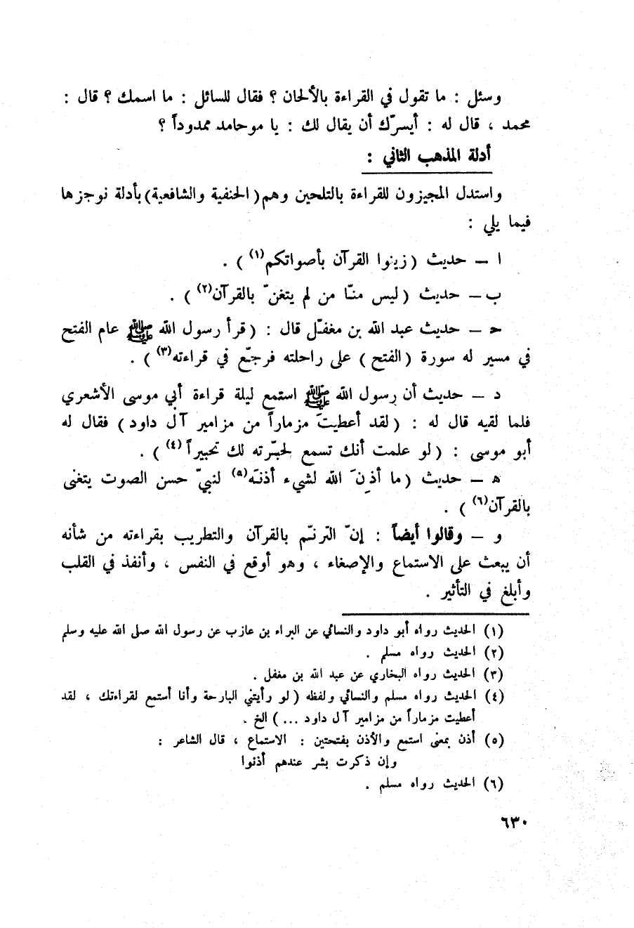 ج - حديث عبد الله بن مغفّل قال: (لقد أعطيتَ مزماراً من مزامير آل داود) فقال له أبو موسى: (لو علمت أنك تسمع لحبّرته لك تحبيراً) .