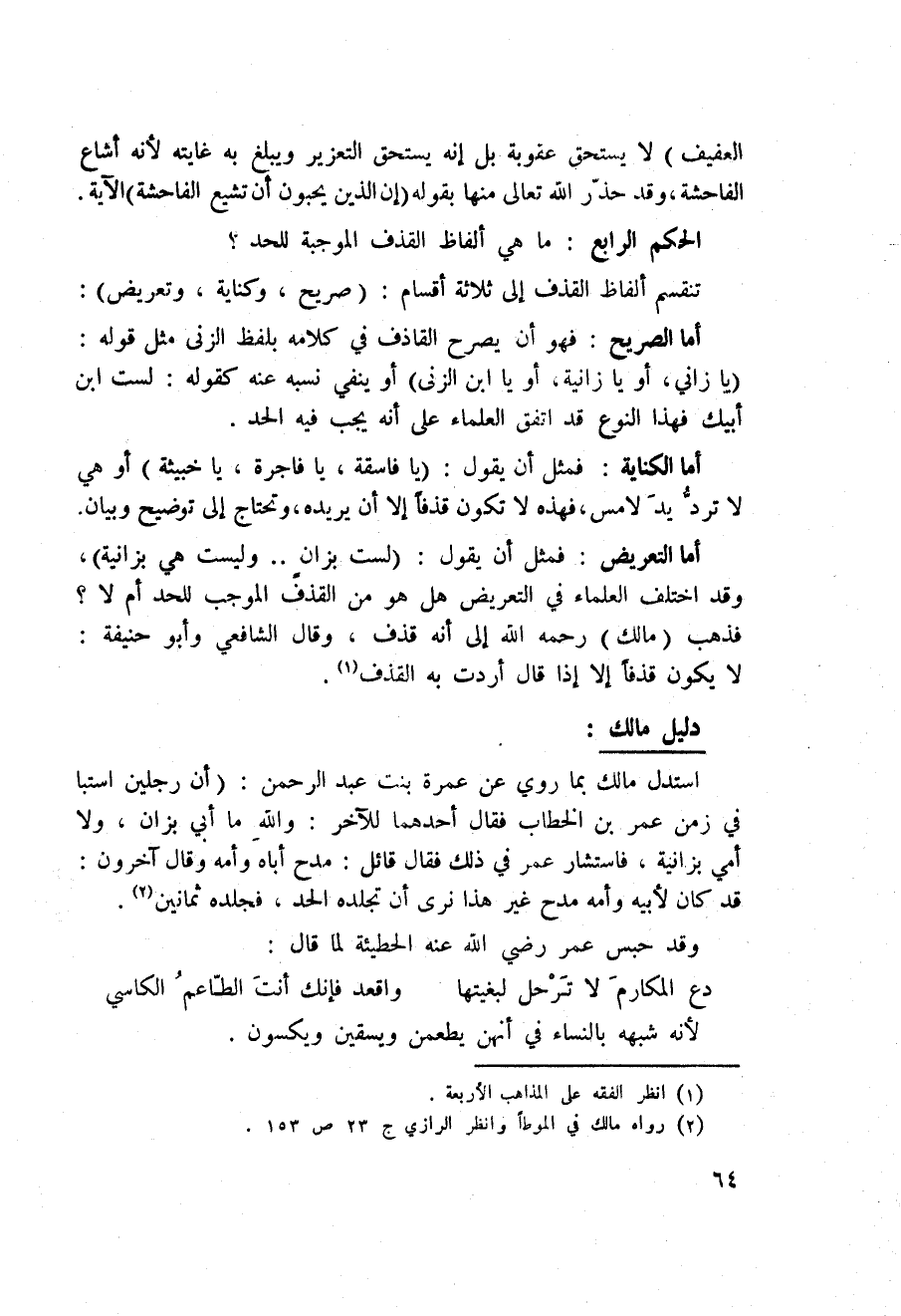 أما التعريض: فمثل أن يقول: (لست بزانٍ. . وليست هي بزانية) ، وقد اختلف العلماء في التعريض هل هو من القذف الموجب للحد أم لا؟ فذهب (مالك) رَحِمَهُ اللَّهُ إلى أنه قذف، وقال الشافعي وأبو حنيفة: لا يكون قذفاً إلا إذا قال أردت به القذف.