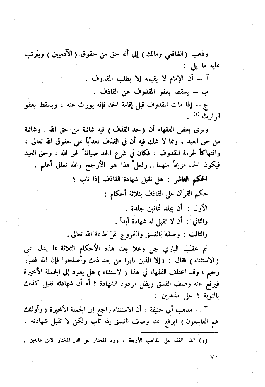 ثم عقّب الباري جل وعلا بعد هذه الأحكام الثلاثة بما يدل على (الاستثناء) فقال: {إِلاَّ الذين تَابُواْ مِن بَعْدِ ذلك وَأَصْلَحُواْ فَإِنَّ الله غَفُورٌ رَّحِيمٌ} قد اختلف الفقهاء في هذا (الاستثناء) هل يعود إلى الجملة الأخيرة فيرفع عنه وصف الفسق ويظل مردود الشهادة؟ أم أن شهادته تقبل كذلك بالتوبة؟ على مذهبين: