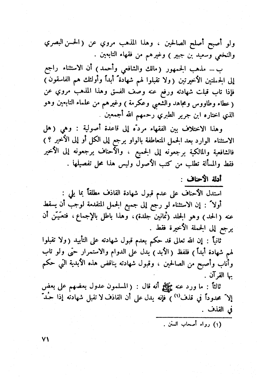 ب - مذهب الجمهور (مالك والشافعي وأحمد) أن الاستثناء راجع إلى الجملتين الأخيرتين {وَلاَ تَقْبَلُواْ لَهُمْ شَهَادَةً أَبَداً وأولئك هُمُ الفاسقون} فإذا تاب قبلت شهادته ورفع عنه وصف الفسق وهذا المذهب مروي عن (عطاء وطاووس ومجاهد والشعبي وعكرمة) وغيرهم من علماء التابعين وهو الذي اختاره ابن جرير الطبري رحمهم الله أجمعين.